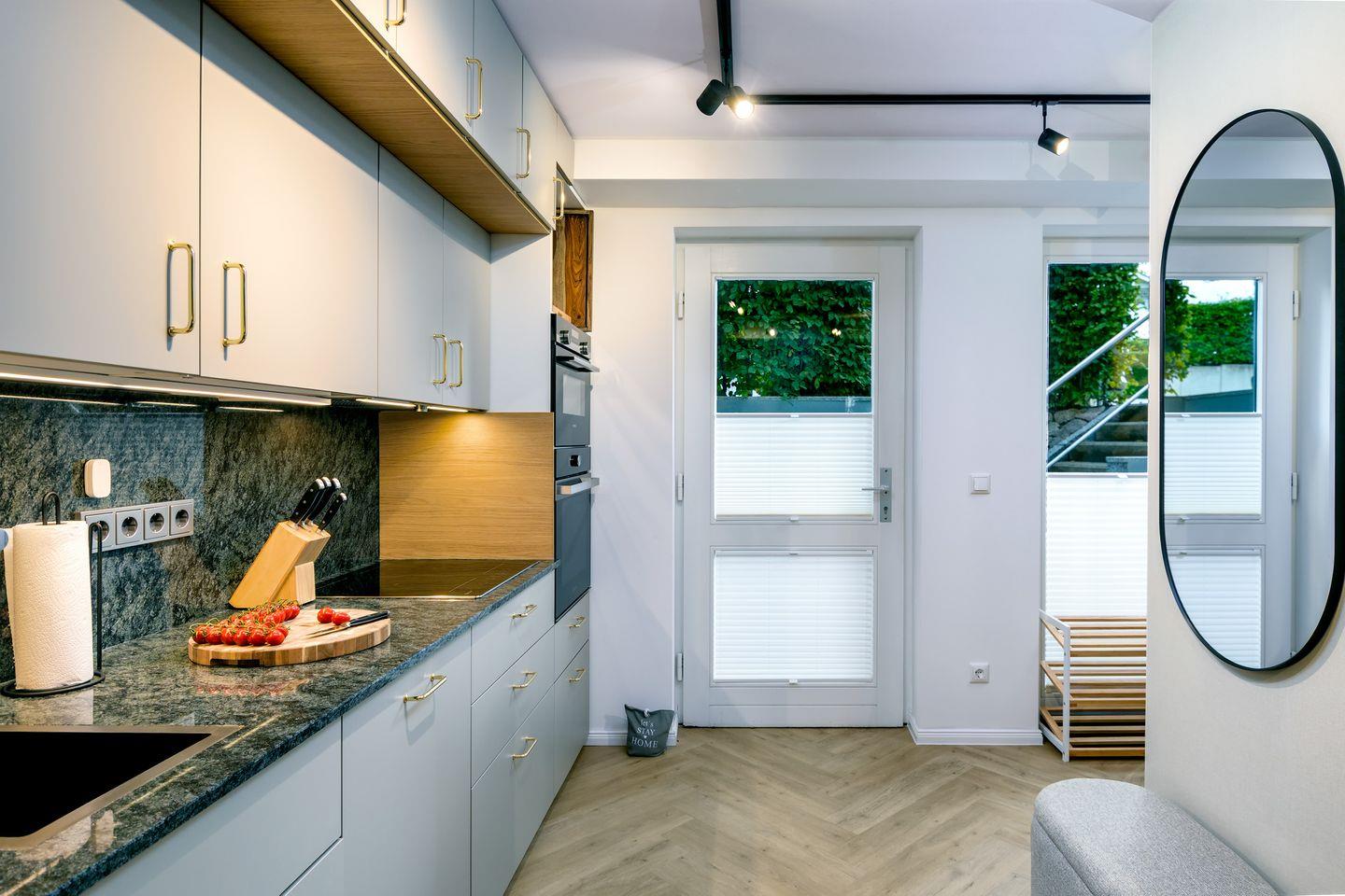 - Voll ausgestattete Einbauküche mit Filterkaffeemaschine, Wasserkocher, Backofen, Mikrowelle, Induktionskochfeld, Geschirrspüler, Kühlschrank mit Gefrierfach, Toaster, Mixer, Crêpemaker, Waffeleisen u.?v.?m.