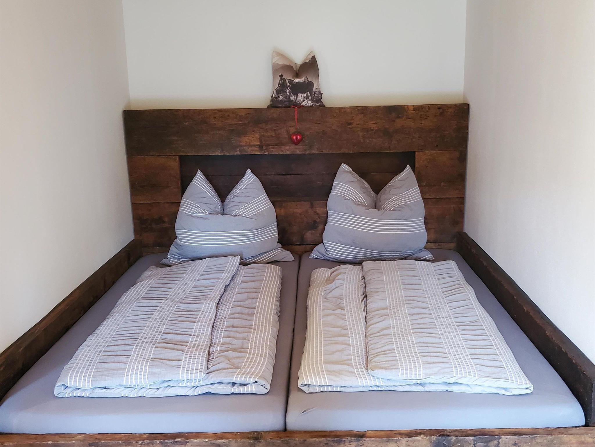 Ein Doppelbett und ein Reisebett im Schlafzimmer und ein bequemes, ausziehbares Schlafsofa im Wohnzimmer.