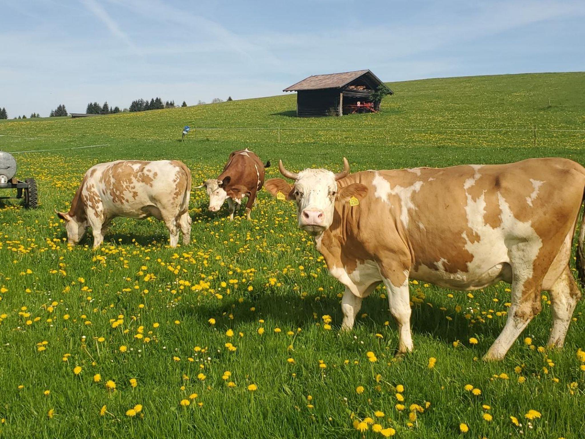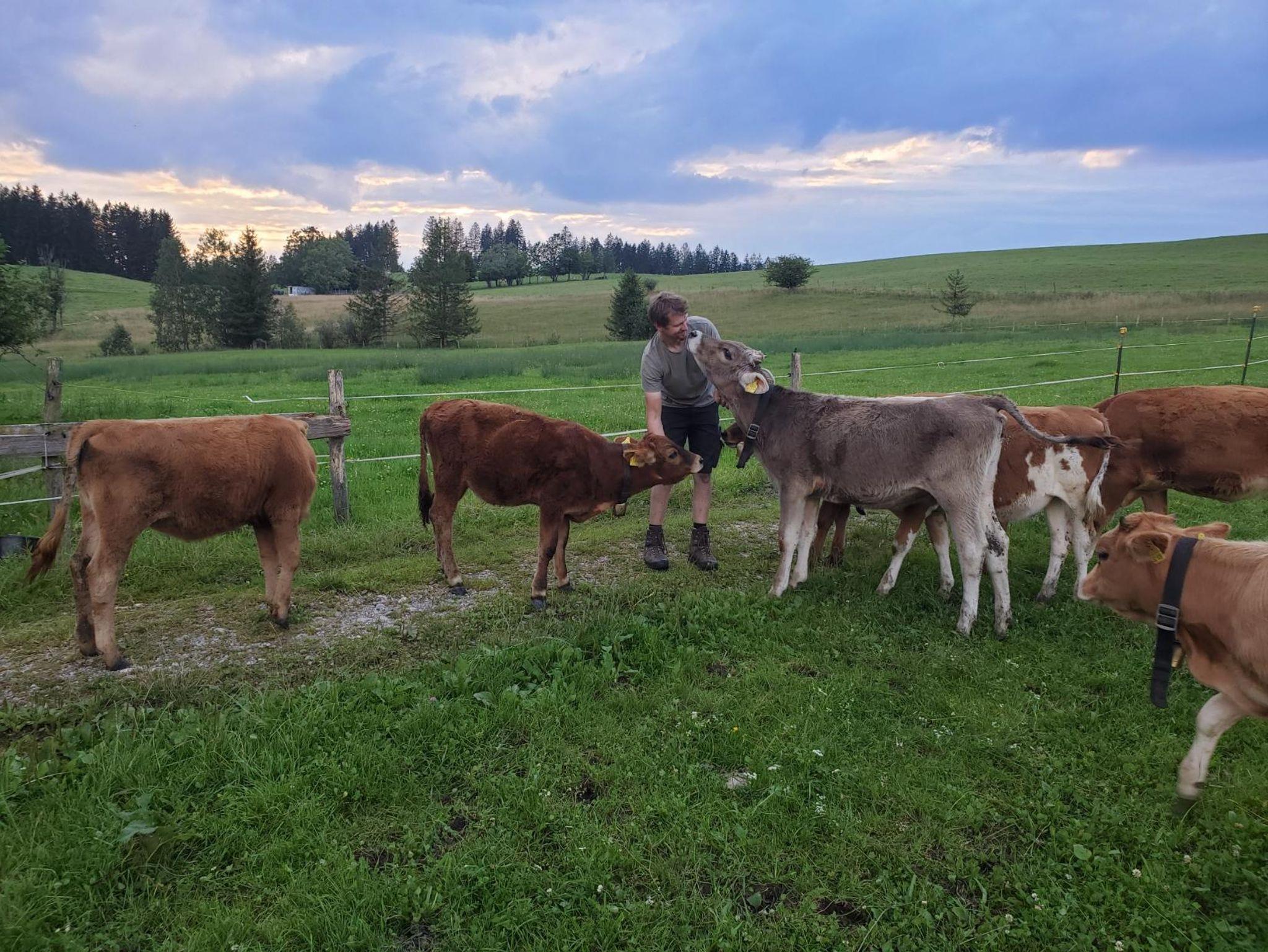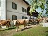 Mit uns leben hier: 11 Milchkühe und deren Nachzucht - auch die Stierkälber, damit sie nicht ins Ausland transportiert werden müssen - (Fleckvieh, Braunvieh und die vom aussterben bedrohte und hier heimische Rasse Murnau Werdenfelser), Esel, Ziegen, Hühner, Gockel und unser Kater Alfons.