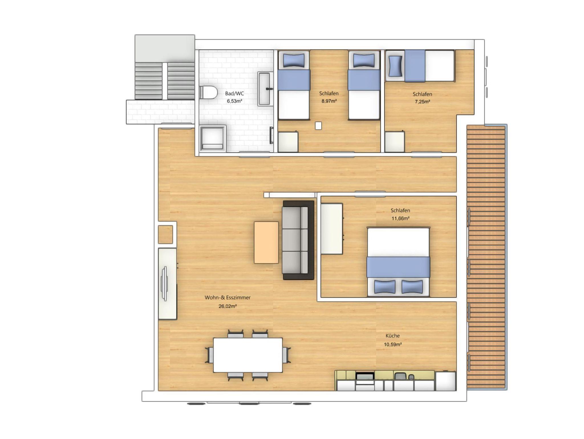 Die FeWo Wetzstein ist Buchbar in drei Varianten(1,2 oder 3 Schlafzimmer). Es gibt ein Bad mit WC, ein Wohnzimmer mit Essbereich und eine Küche. Die Wohnung hat ca. 80qm. Die einzelnen Raumgrößen können sie in dem Grundriss der Wohnung bei den Bildern einsehen.