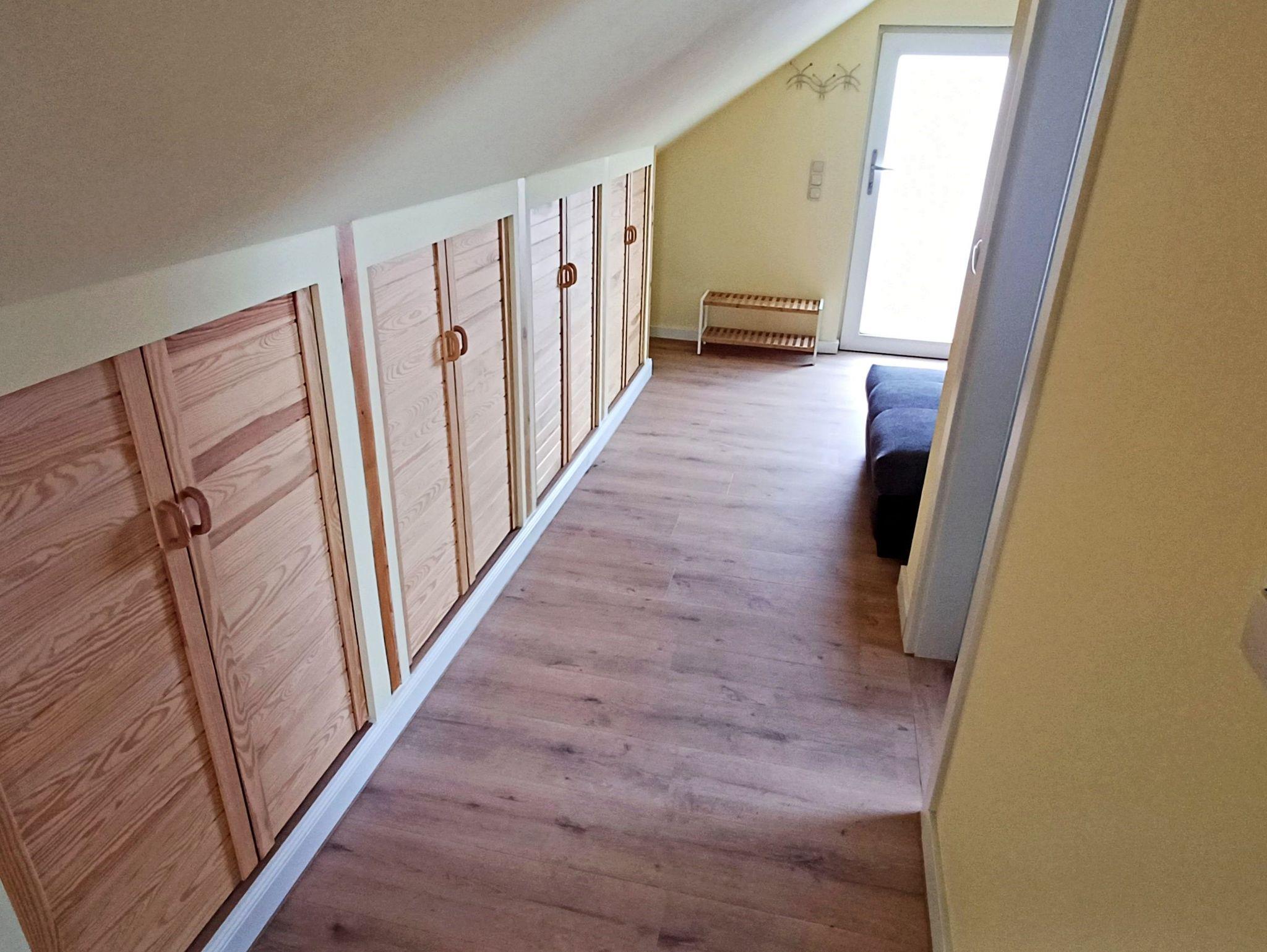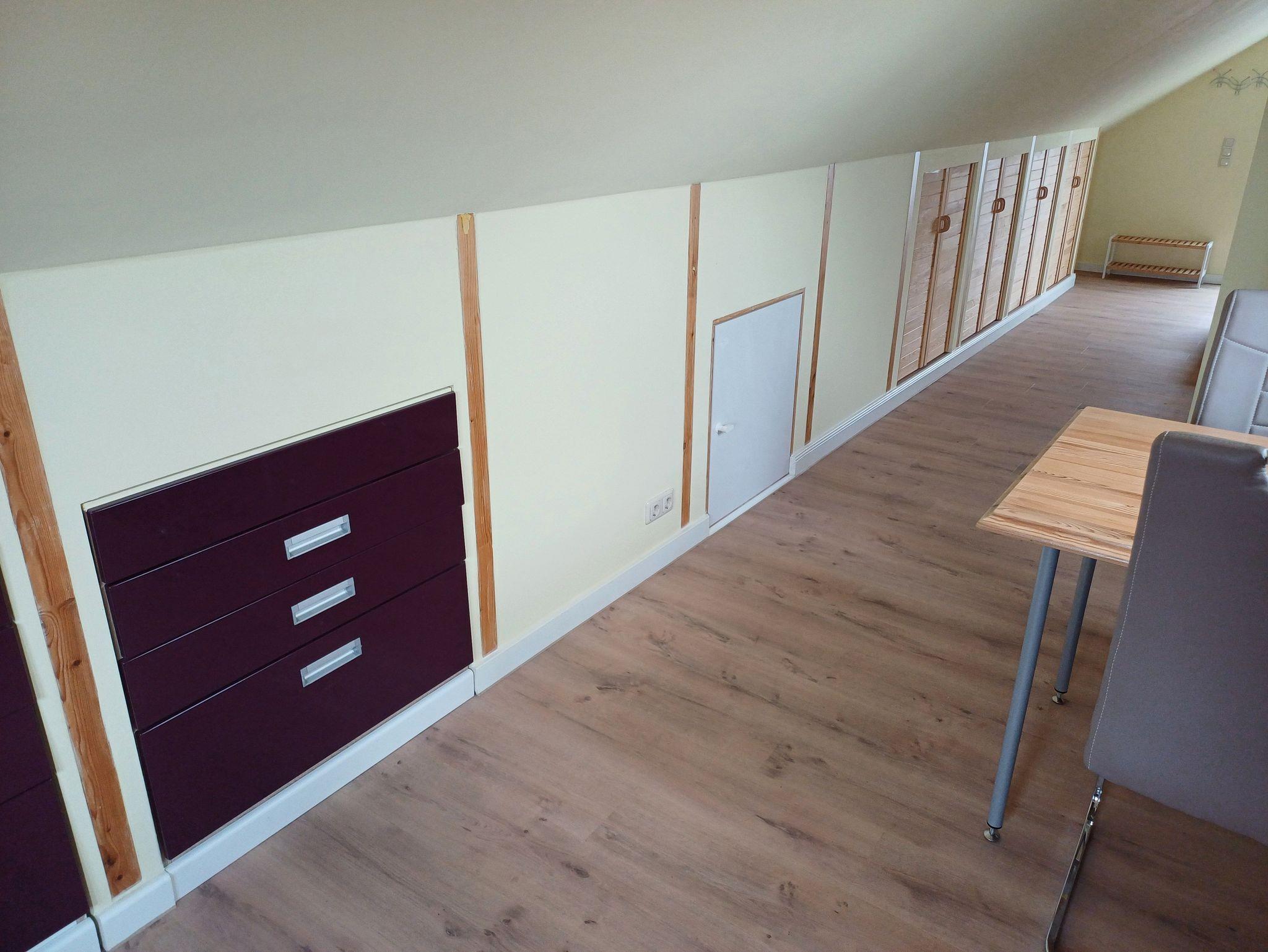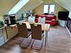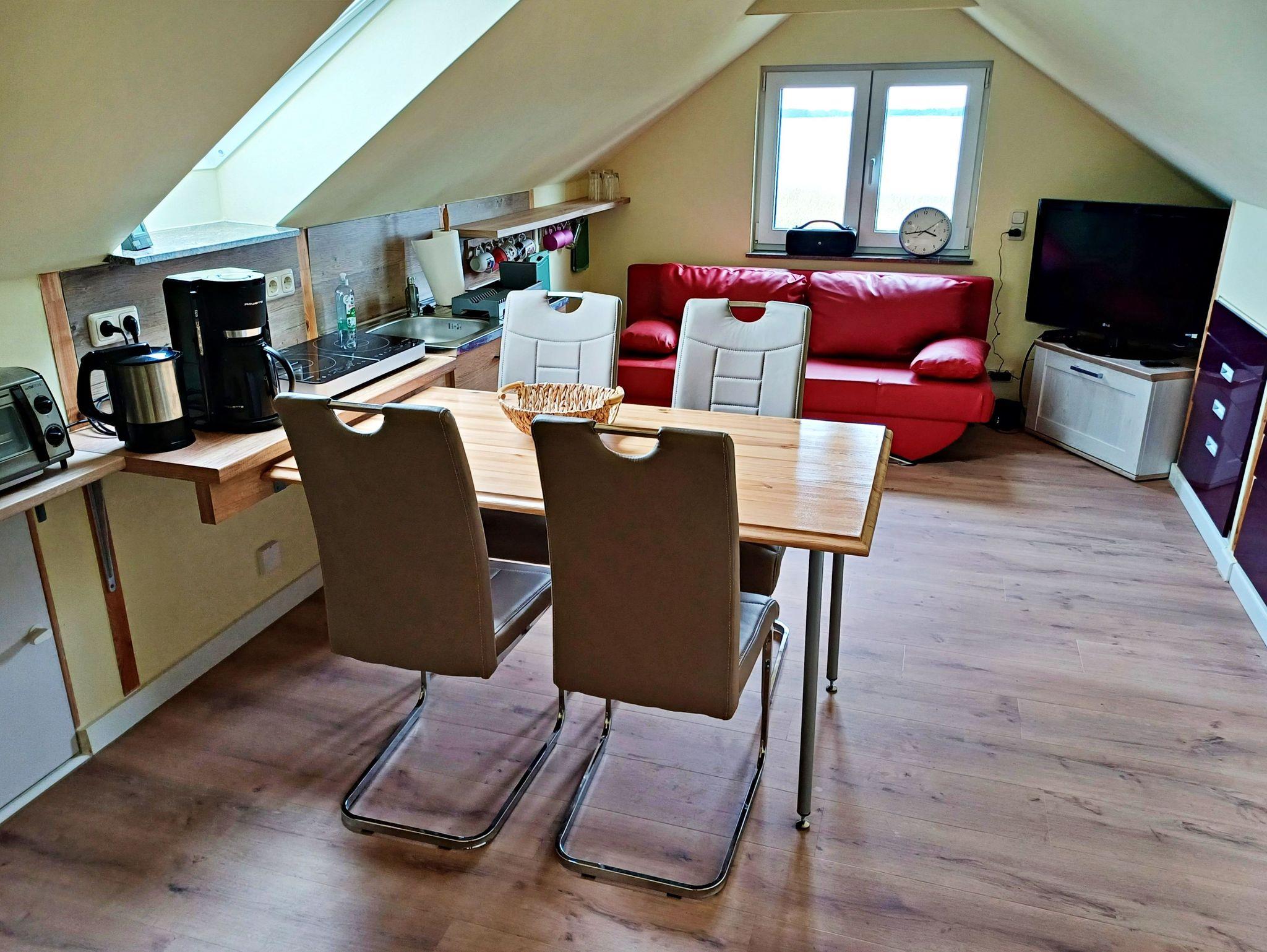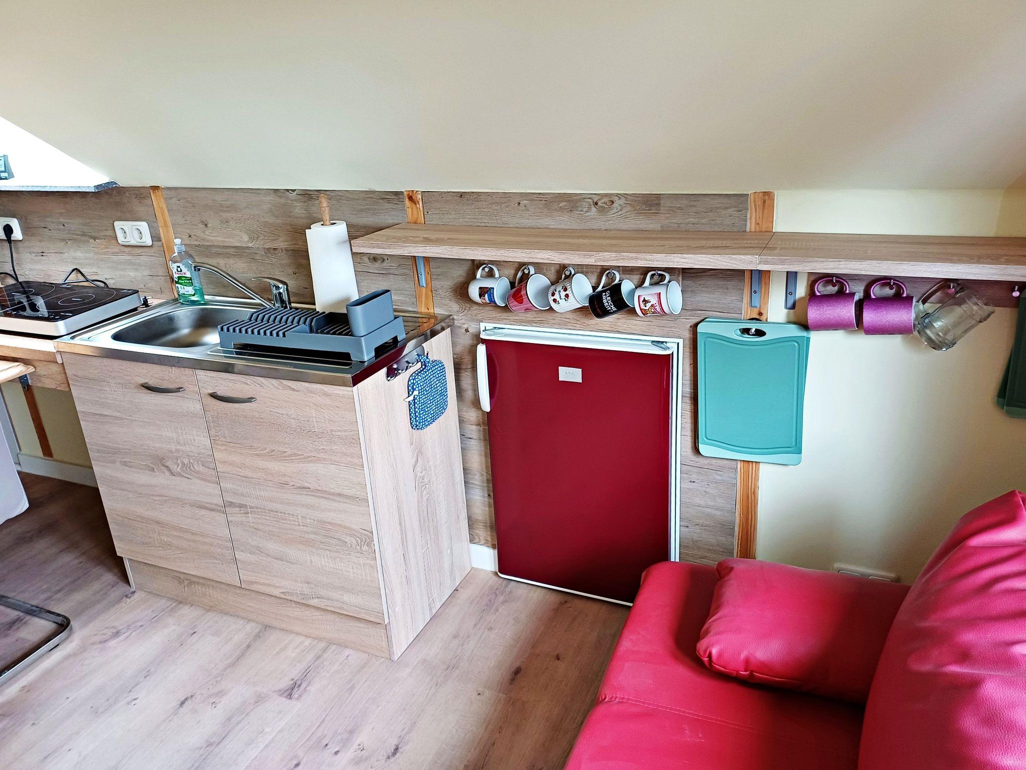 Die Ferienwohnung im Oberschoss ( Dachgeschoss mit Dachschrägen) mit sep. Eingang über eine Treppe von außen ist ausgestattet mit einer Schlafcouch für 2 Personen, separater Küchenzeile mit 2-Platten-Herd, Kühlschrank, Kaffeemaschine, Wasserkocher sowie Toaster. Das kleine Bad verfügt über DU/WC. Auf der ca. 9 qm großen möblierten Terrasse mit Strandkorb können Sie morgens Ihren Kaffee genießen oder den Abend bei einem Glas Wein ausklingen lassen.