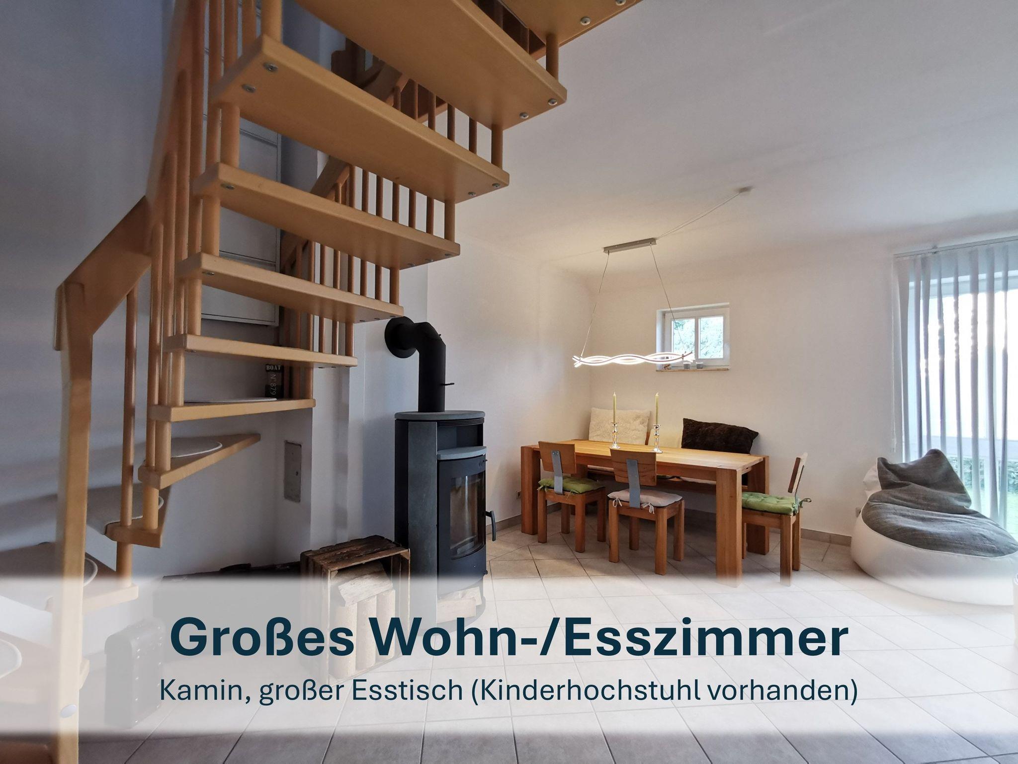 Am Ende des Flurs befindet sich der großzügige Wohnraum mit einer offenen, vollständig ausgestatteten Küche. Ein großer, hölzerner Esstisch bietet ausreichend Platz für bis zu 6 Personen. Eine gemütliche Couch und ein Sitzkissen laden zum gemeinsamen Entspannen vor dem großen Flat-TV ein. Ein Kamin verspricht auch bei nicht so gutem Wetter ein gemütliches Ambiente.