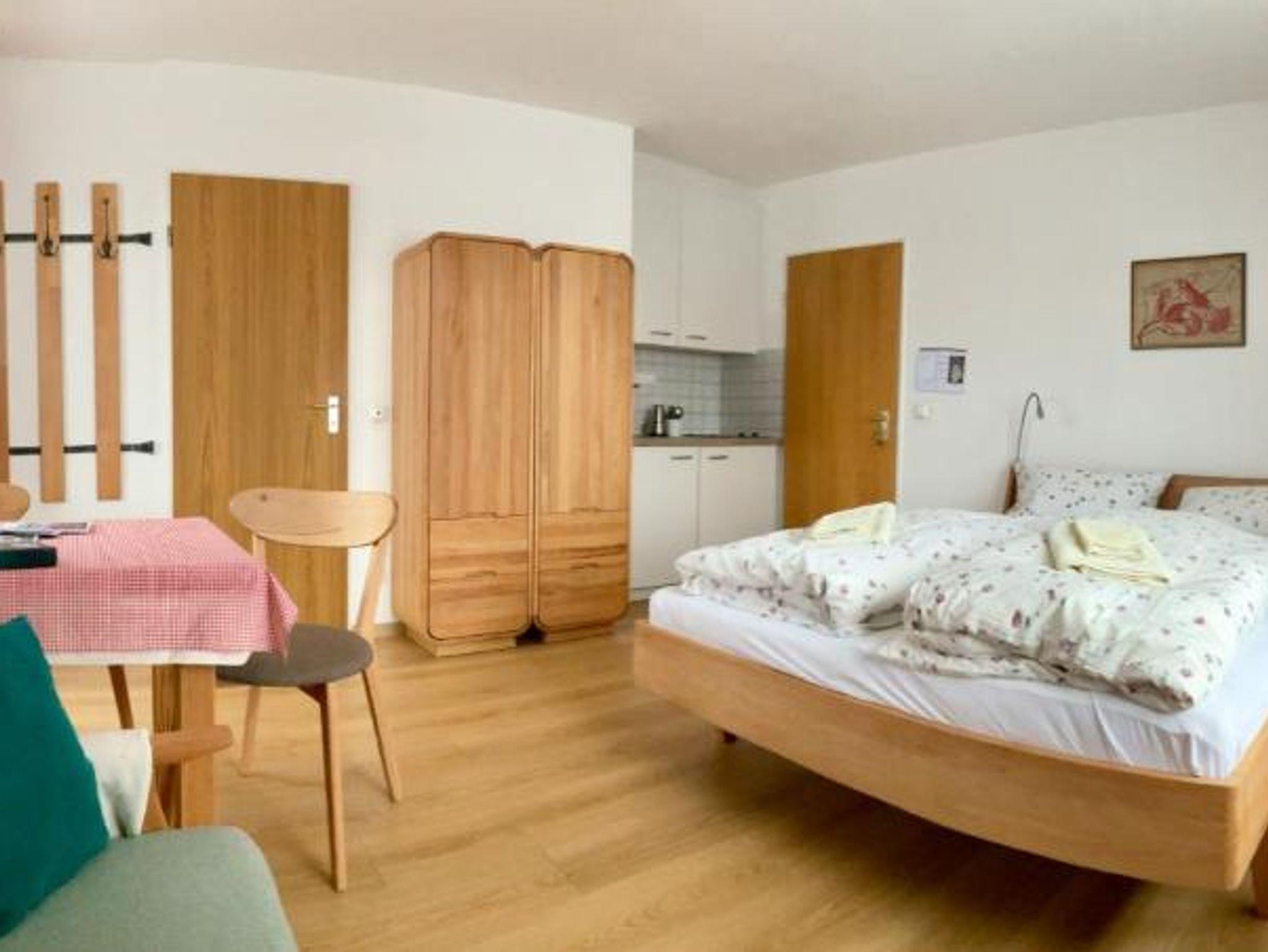 Das Kleinappartement mit 26 qm ist neu eingerichtet mit luxuriösem Bad/WC mit Fußbodenheizung, kleiner Kochnische mit 2-Plattenherd, Kaffeemaschine, Toaster, Kühlschrank mit Gefrierfach, Eßecke und einer kleinen Sitzcouch ausgestattet. Auf dem ruhigen Balkon hat man eine wunderschöne Sicht auf die Berge. Das App. ist auch gut geeignet für 1 Person (abzüglich 4 Euro).