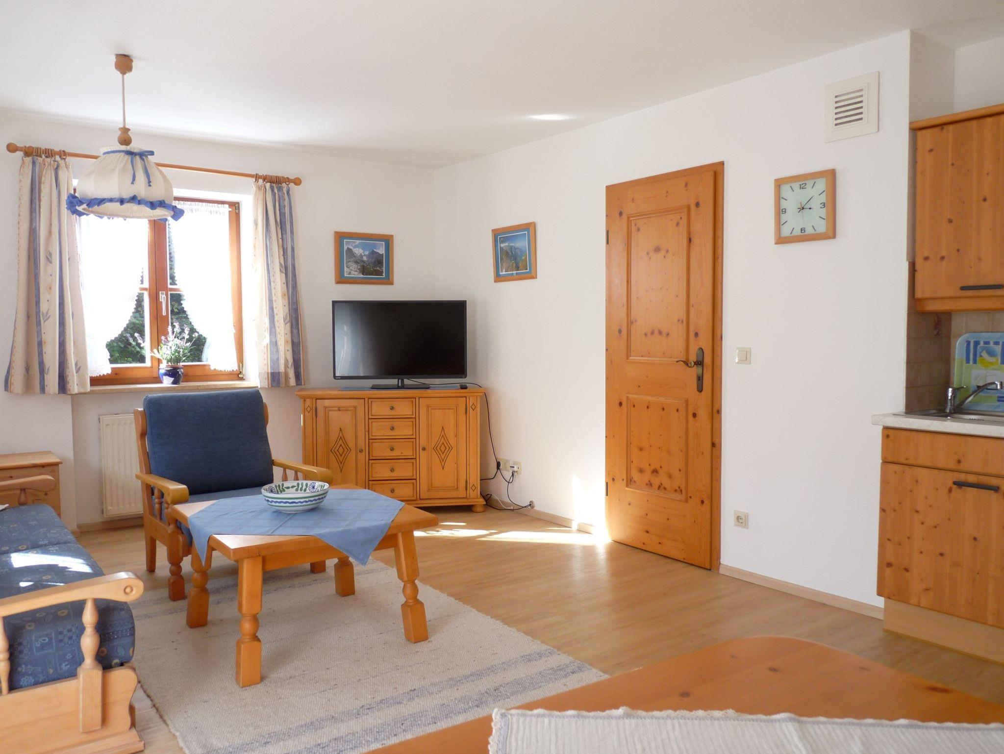 Unsere Ferienwohnung befindet sich im Erdgeschoß und bietet Platz auf 42 qm. Sie ist ausgestattet mit einem sep. Schlafzimmer, Wohnküche mit Essecke, Ausziehcouch, Flachbildfernseher und kleiner Küchenzeile mit Minibackofen, Badezimmer mit Dusche und WC. Kleine Diele mit Garderobe. Terrasse mit Gartenmöbel mit Bergblick.