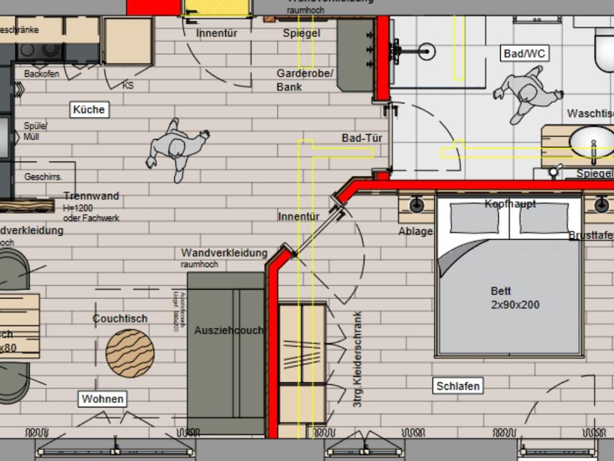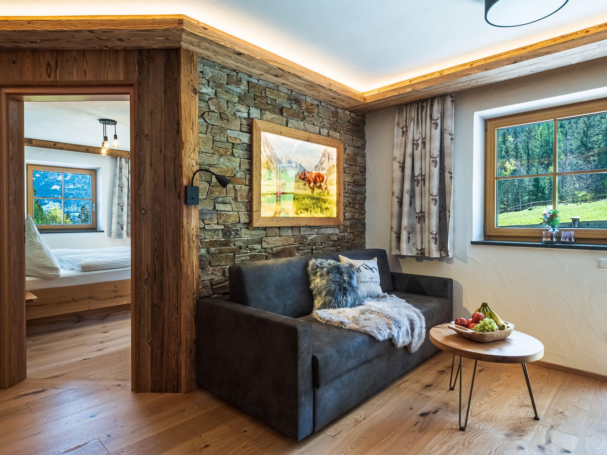 Appartment mit Altholz, 40qm, Doppelbett 1,80 x 2,00, eine Schlafcouch mit Lattenrost und Matratze ist in der Wohnküche vorhanden, Breite 1,60 Küche, Bad, Fön, Terasse mit Bergblick.