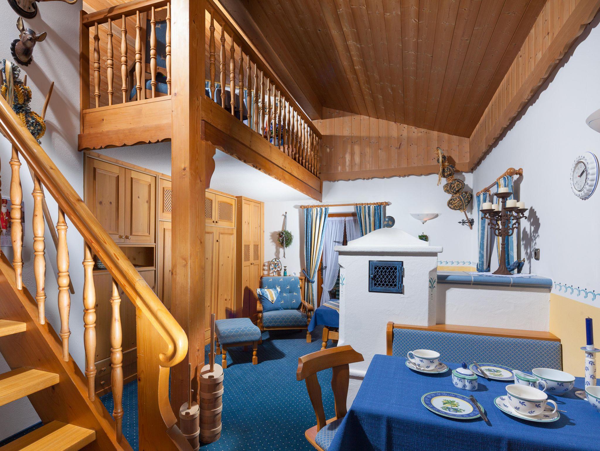 Ferienwohnungen Dankllehen, Maisonette-Ferienwohnung Grünstein, 1-2 Personen, 60 qm, 1 Schlafzimmer, Wohnzimmer mit Kachelofen, Balkon