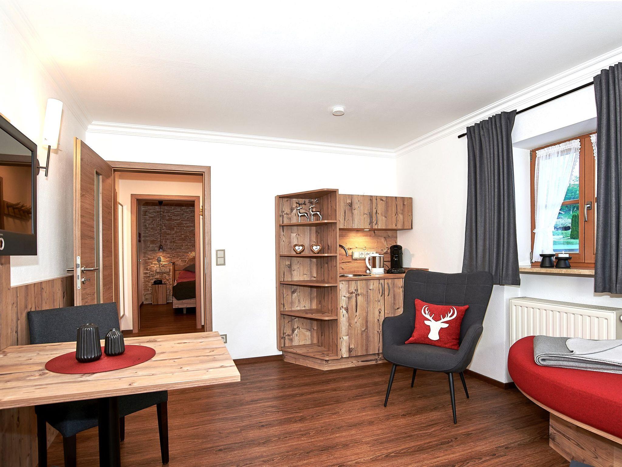 Bestimmt wird unser Zweizimmer- Apartment GAMSNEST Ihr Lieblingsplatz! Ein gemütlicher Wohnraum mit Kaffeeküche, Essecke und Schlafcouch sorgen für eine behagliche Stimmung, Sat-TV, Radio, WLAN, Telefon stehen zur Verfügung. Ein ruhiges Schlafzimmer sowie ein Bad mit Dusche/WC, Handtuchwärmer, Kosmetikspiegel, Waage, Fön und Fußbodenheizung gehören ebenfalls zur Ausstattung. Der Balkon erlaubt einen Panoramablick in Ostrichtung zum phantastischen Sonnenaufgang hinter dem Kehlstein. Buchen Sie auf