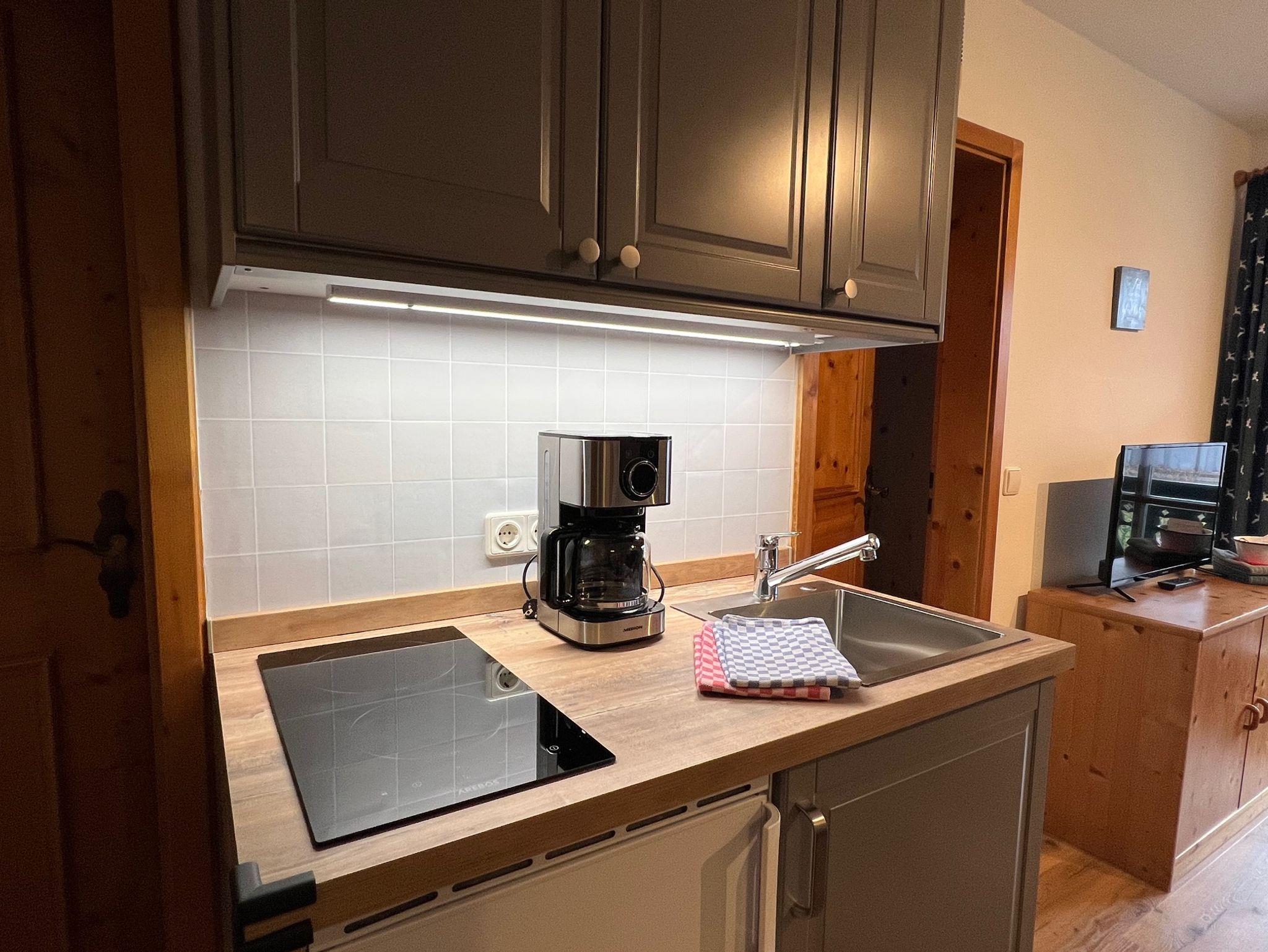 Die gemütlich eingerichtete Nichtraucher-Ferienwohnung bietet Platz auf 35 qm und liegt im 1. Obergeschoß. Sie ist ausgestattet mit einem separaten Schlafzimmer mit Doppelbett, einem Wohnzimmer mit Sofa, Radio, TV, WLAN, Essbereich mit Eckbank, sowie einer komplett eingerichteten kleinen Küchenzeile. Im Bad stehen Dusche und WC zur Verfügung. Auf dem möblierten Balkon haben sie einen wunderbaren Bergblick. Auch Ihre Haustiere sind bei uns herzlich willkommen.