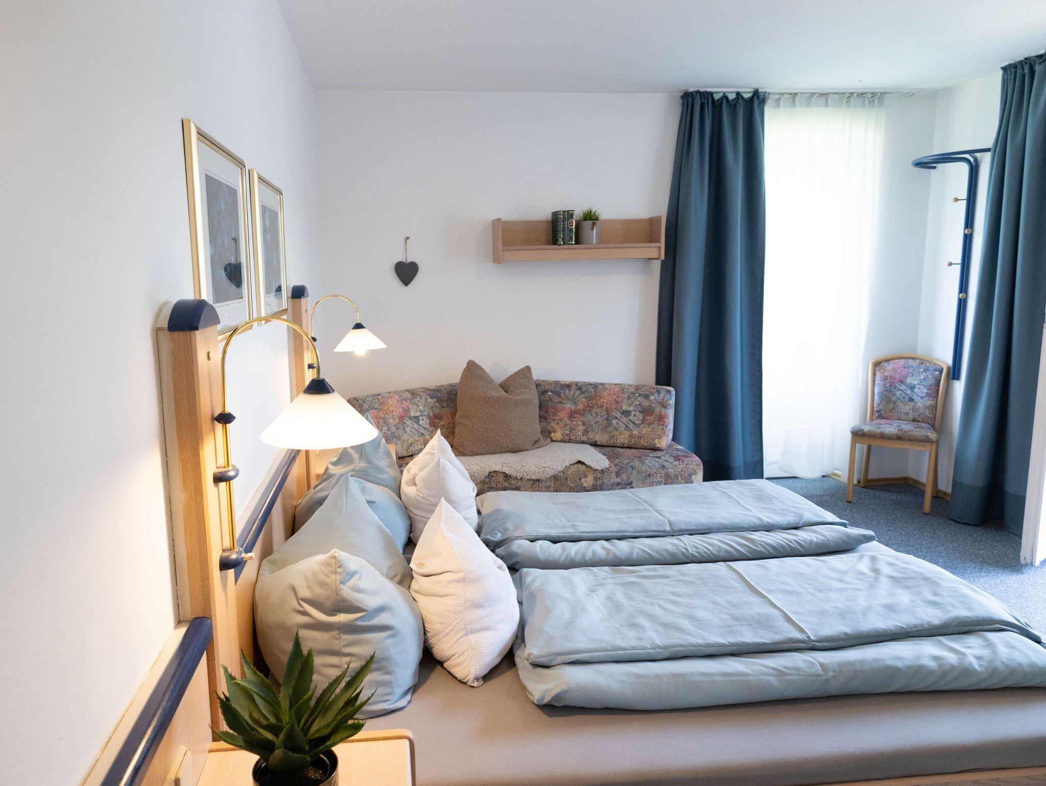 Es ist ausgestattet mit einem Doppelbett 180/200 einem zusätzlichen Schlafsofa 90/200 und einer kleinen Sitzgruppe, TV, WLAN und einem abschließbaren Nachtkästchen.