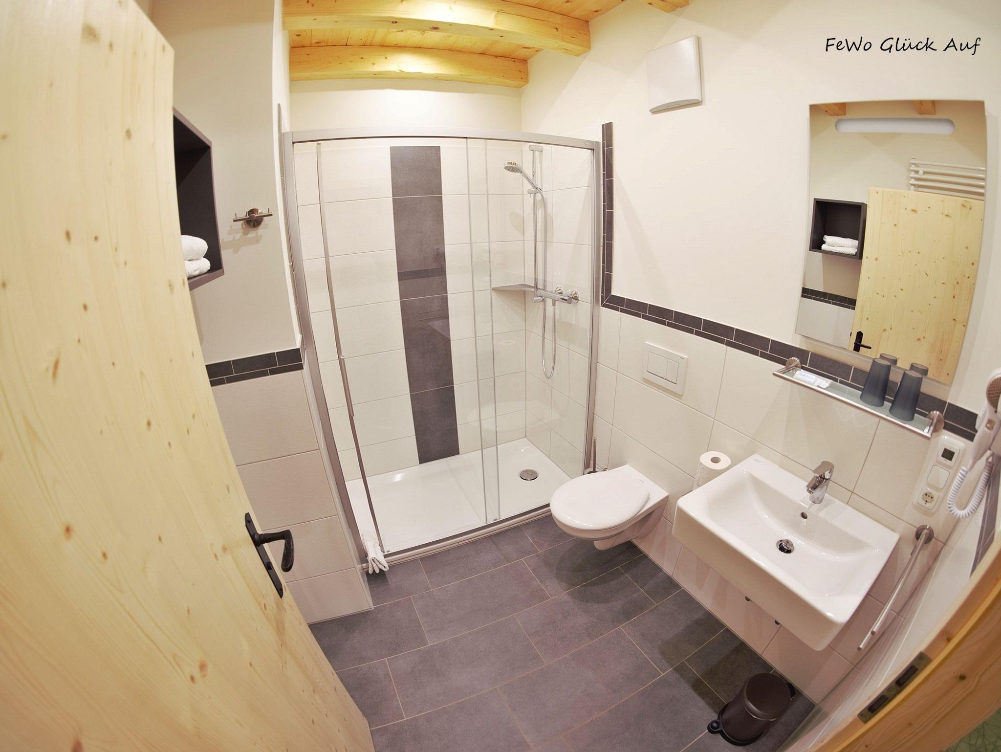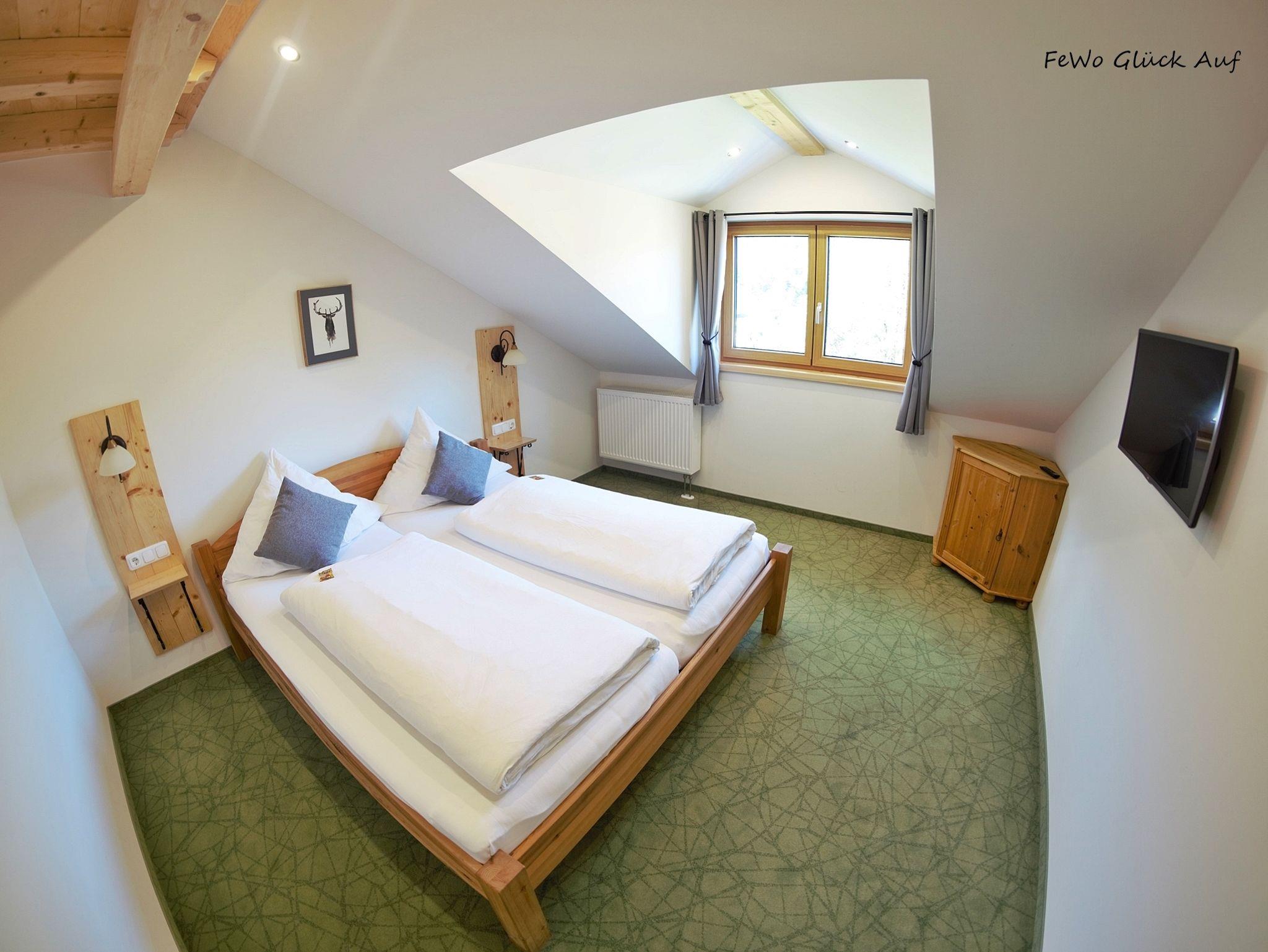 Die Ferienwohnung Glück Auf befindet sich im 2. Obergeschoß unseres Hauses und bietet Platz für 2-4 Personen. Unsere 2019 neu gebaute Ferienwohnung verfügt über ein Schlafzimmer, ein Badezimmer mit Dusche & WC sowie Radio und Föhn. Hausgang mit Kleiderschrank und Garderobe. Für einen gemütlichen Start in den Tag oder einen gemütlichen Abend, sorgt unsere offene Wohnküche, diese ist ausgestattet mit Kühlschrank inkl. Gefrierfach, Herd und Backofen, Kaffeemaschine-Padmaschine (Pad`s werden nicht gestellt), Toaster und Wasserkocher, eine Mikrowelle, sowie eine Bartheke mit 2 gemütlichen Barhockern. Die offen gestaltete Küche bietet Ihnen viel Platz zum Kochen im Beisein Ihrer Familie. Großer Esstisch mit 4 Sitzplätzen (Kinderstühle auf Anfrage). Eine große gemütliche Couch lässt Sie den Tag entspannt ausklingen. 2 Sat-TV (Schlafzimmer und Wohnbereich), WLAN in der gesamten Wohnung, gesamt 3 große Dachgauben mit Bergblick auf den Grünstein und unseren Hof. Brötchenservice (im Haus) gegen Aufpreis möglich. Babybett auf Anfrage. Handtücher und Bettwäsche werden bereitgestellt.