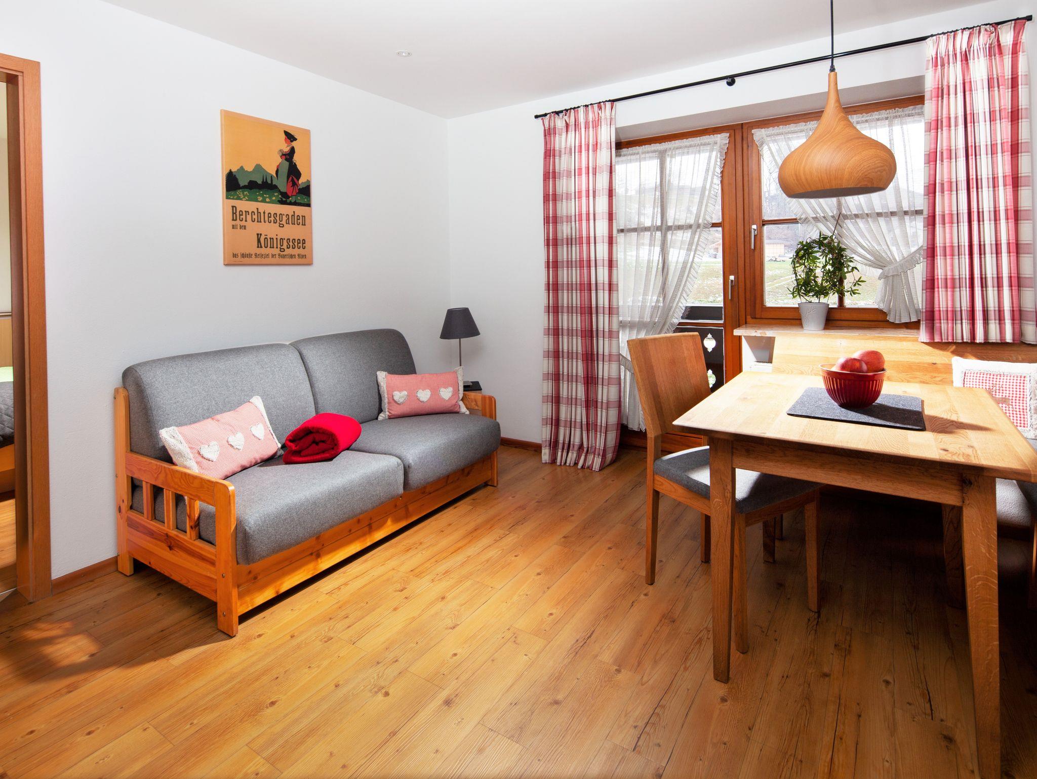 Gipfelglück in unserer stimmungsvollen 42qm Ferienwohnung ALPENGRUSS, mit Balkon. Lieblingsplatz mit einem gemütlichen Wohnraum mit Essecke, Couch, TV, Radio und Stereoanlage, Telefon, Internetzugang, ein helles, freundliches Schlafzimmer, eine volleingerichtete Küche mit Spülmaschine, DU/ WC u. Balkon. Genießen sie den Balkon mit Blick auf unsere 3 ha große Wiese und den mächtigen Untersberg!