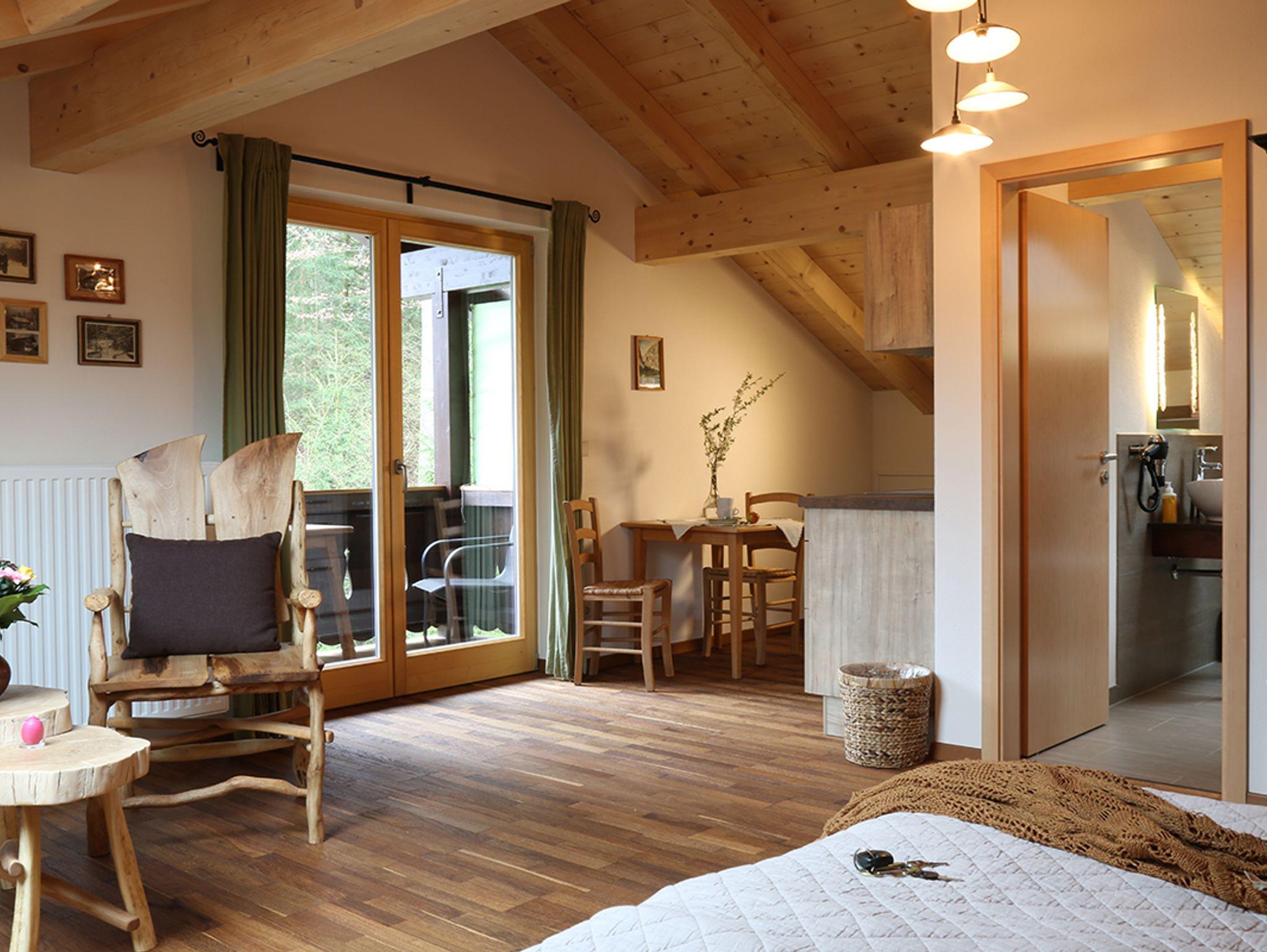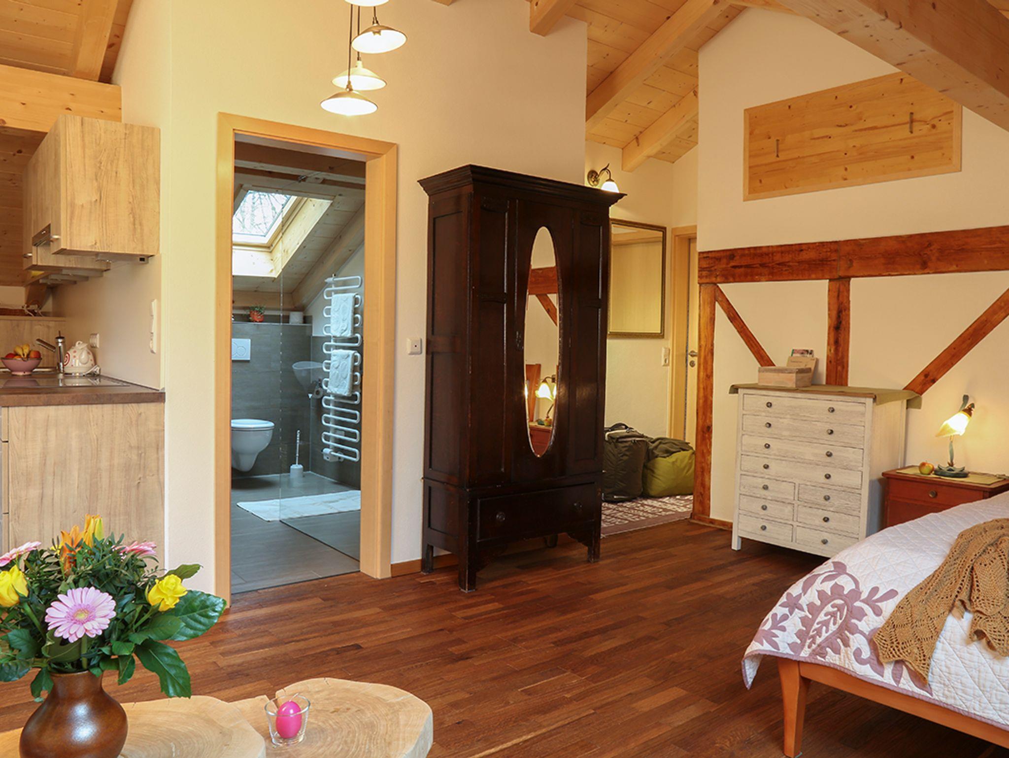 Großzügiges Studio mit begehbarer Dusche & WC, gemütliche Sitzecke, teils antiken & teils handgefertigten Vollholzmöbeln und komplett eingerichteter Küche mit Essbereich. Balkon mit Blick auf Watzmann.