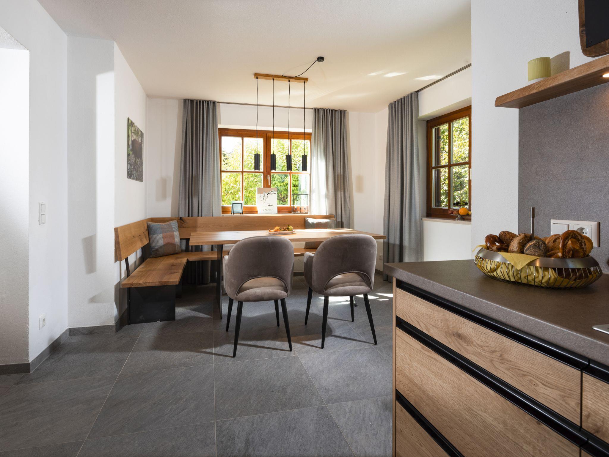 Die Ferienwohnung Königssee bietet mit 97 qm Platz für bis zu vier Personen und befindet sich im Erdgeschoss. Es sind zwei separate Schlafzimmer mit hochwertigen Boxspringbetten, sowie eine Eichenküche mit großer Eckbank und Essplatz vorhanden. Die Küche ist mit sämtlichen Geschirr und Kochutensilien ausgestattet. In der Wohnung sind drei Flachbild-TVs mit SAT-IP vorhanden. Im Bad befindet sich eine Infrarotkabine von Tylö. Eine Waschmaschine und ein Wäscheständer dürfen auf Anfrage und gegen Gebühr verwendet werden.