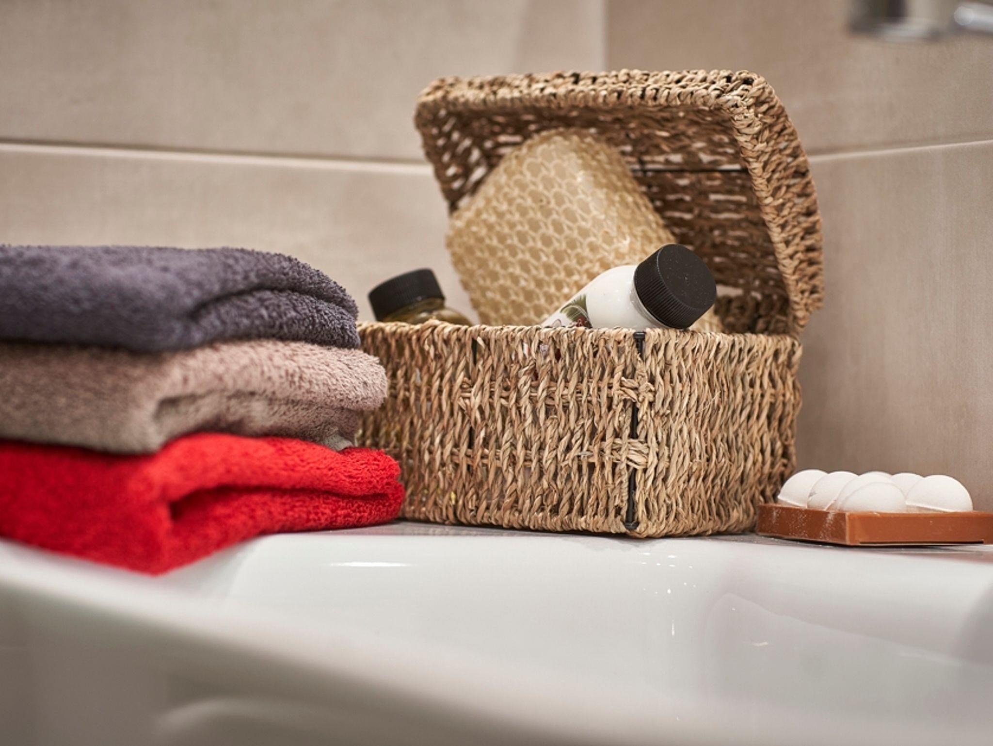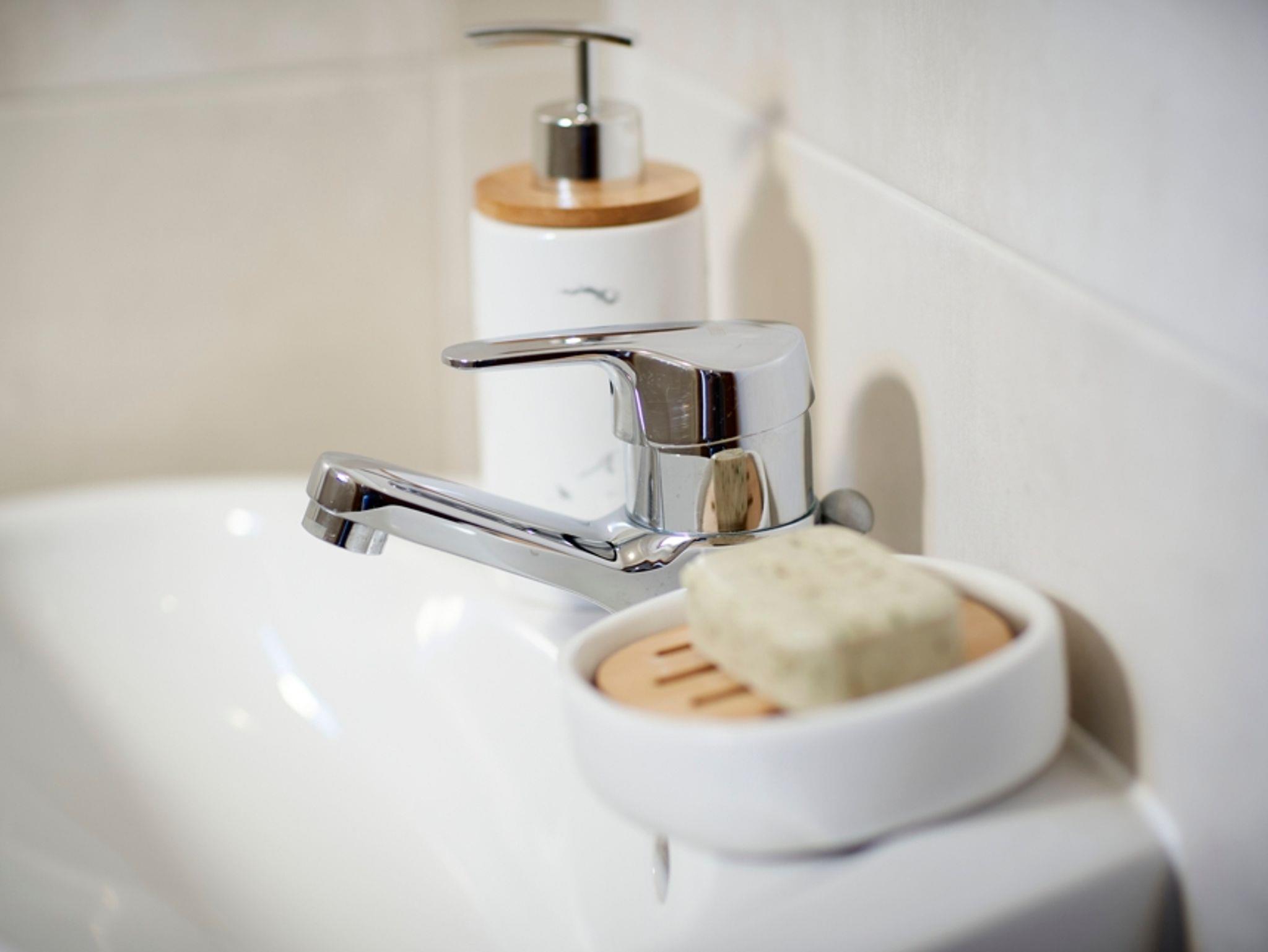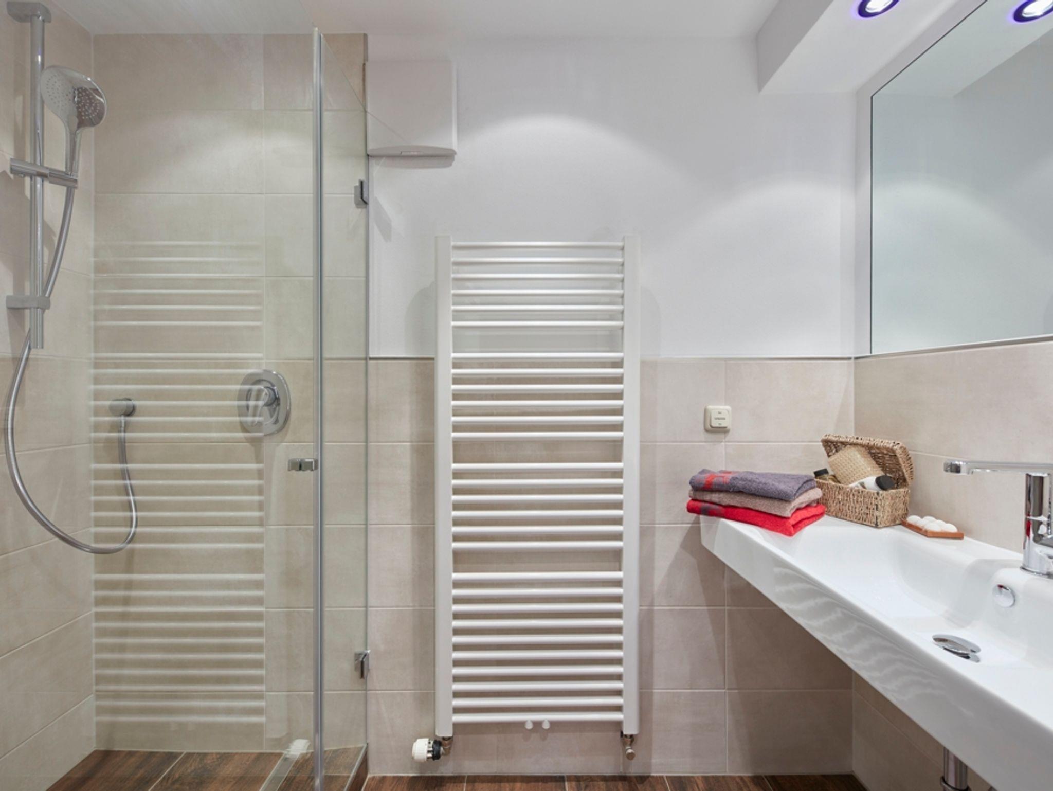 Im modernen Bad mit geräumiger Dusche und großem Waschbecken ist genug Platz zum wohlfühlen. Die Wohnung verfügt über eine separate Toilette.