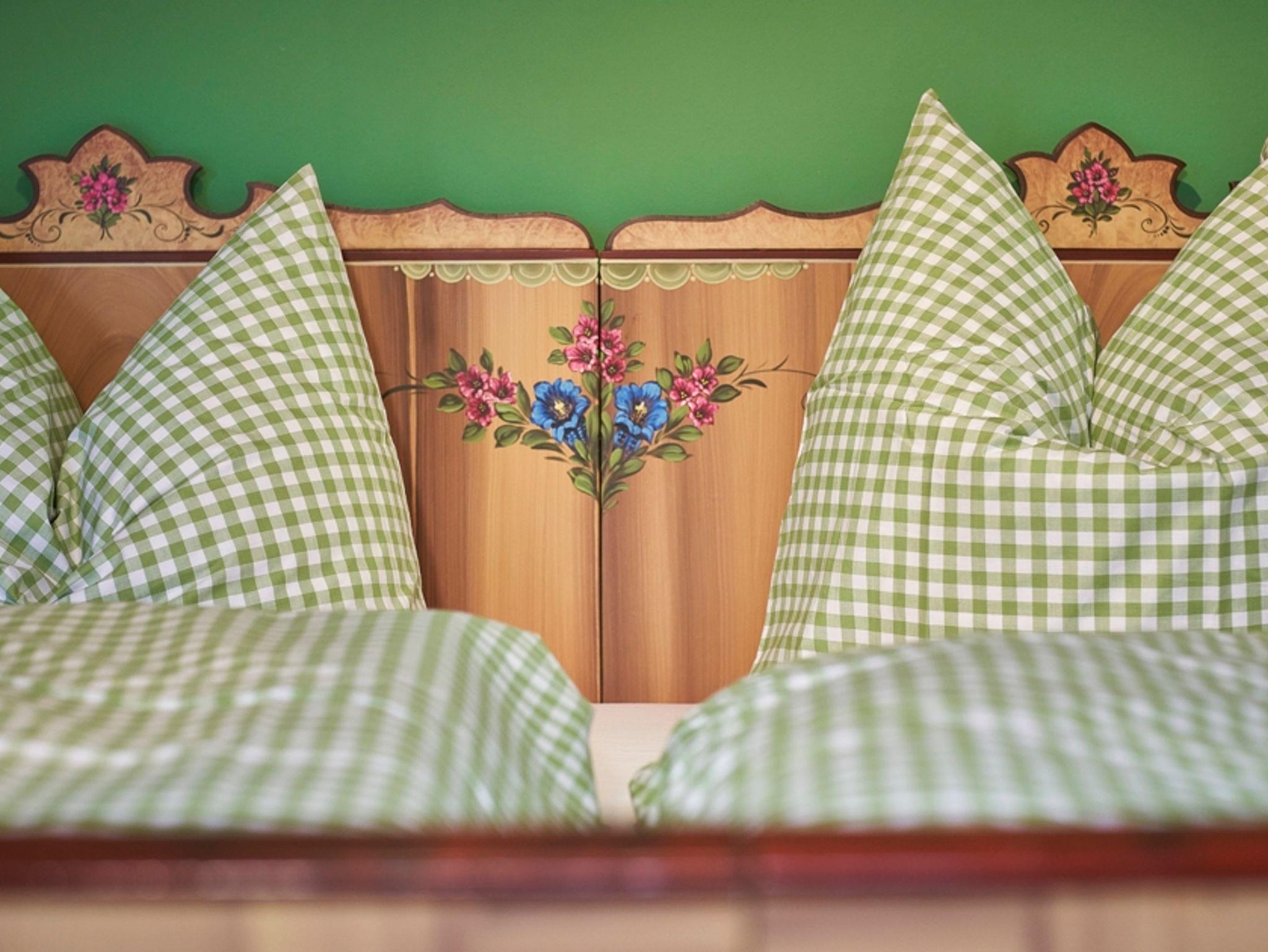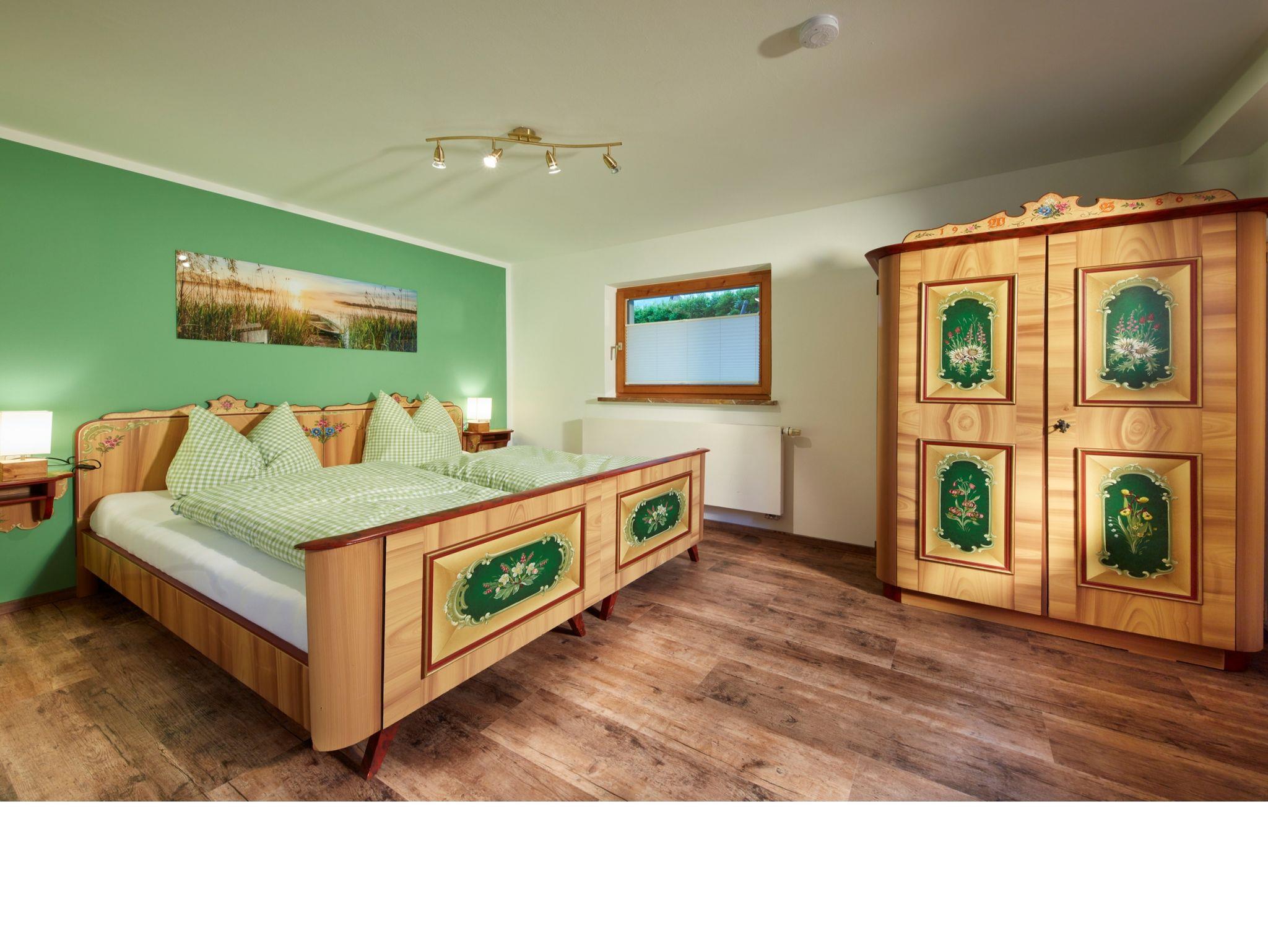 Das Schlafzimmer ist mit seinem Bauernschrank gemütlich, alpenländlich eingerichtet.