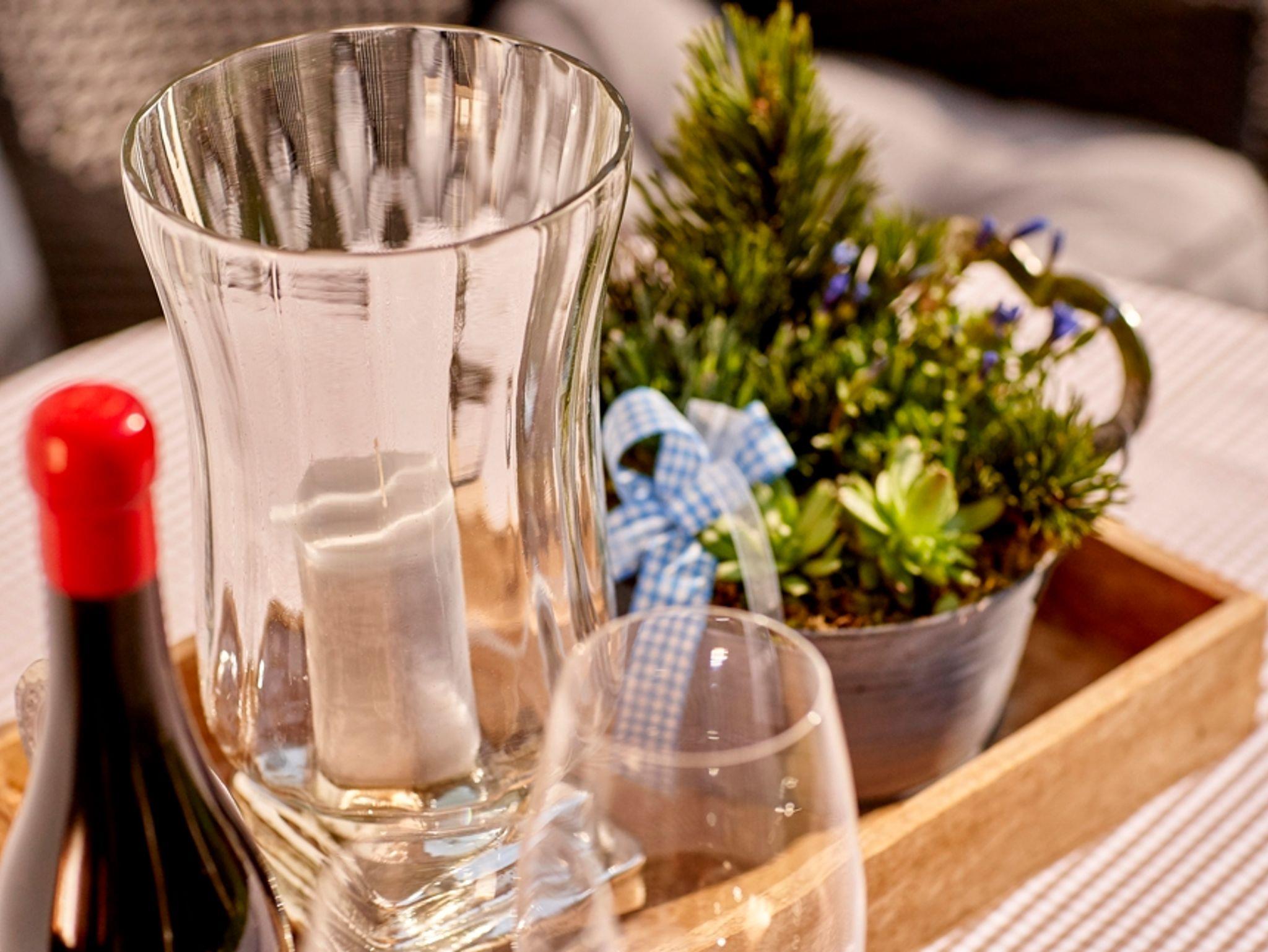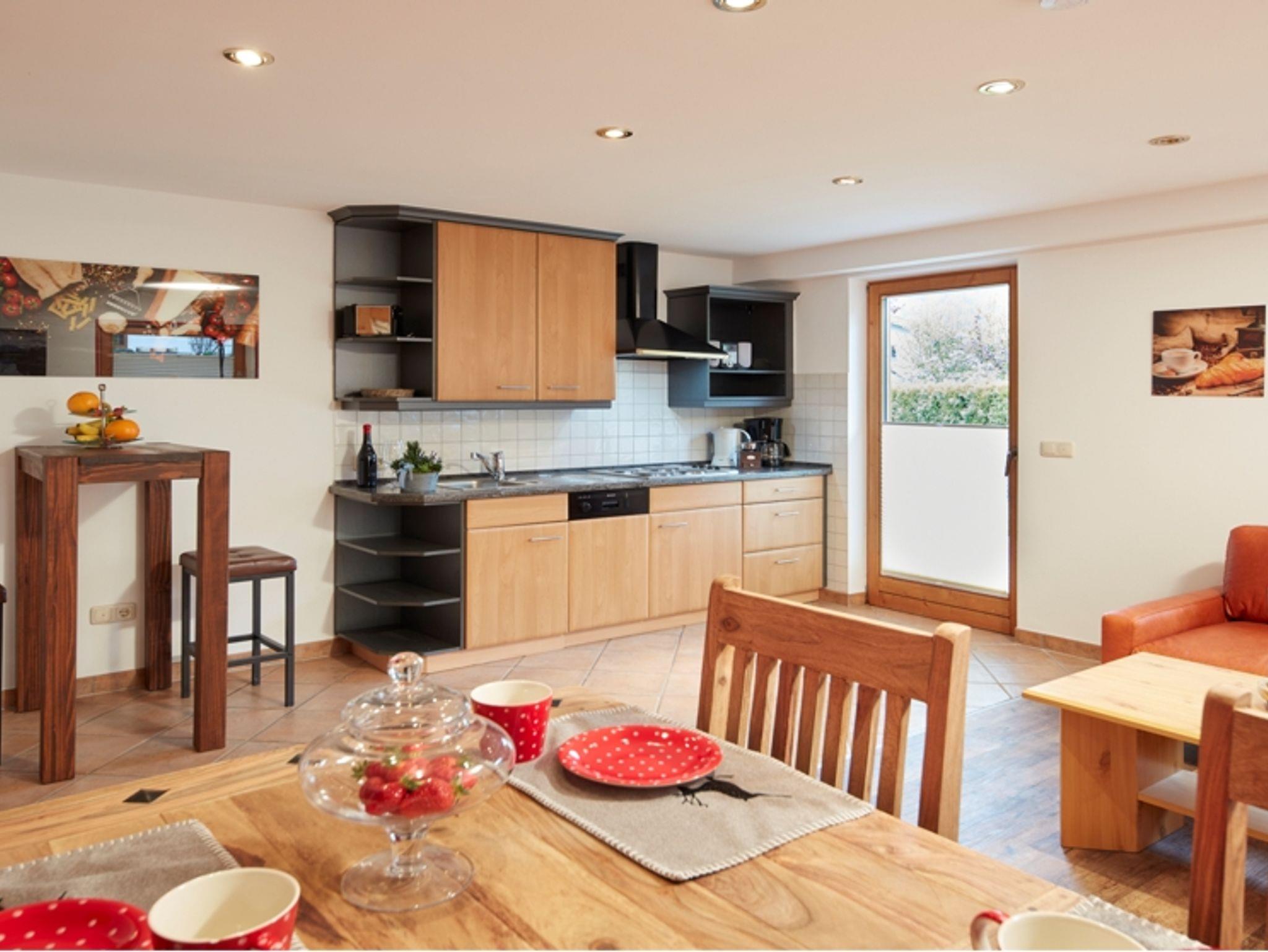 Das Wohnzimmer besticht mit seinem Gartenbergblick, gemütlichem Sofa, Fernseher, Musikanlage und Holzparkettboden. Gegessen wird in der gemütlichen Essecke. Die Küchenzeile ist vollständig ausgestattet mit Herd, Backofen, Spülmaschine, Kaffeemaschine, Mikrowelle und Toaster. Einen Akzent setzt die gemütliche Essecke.