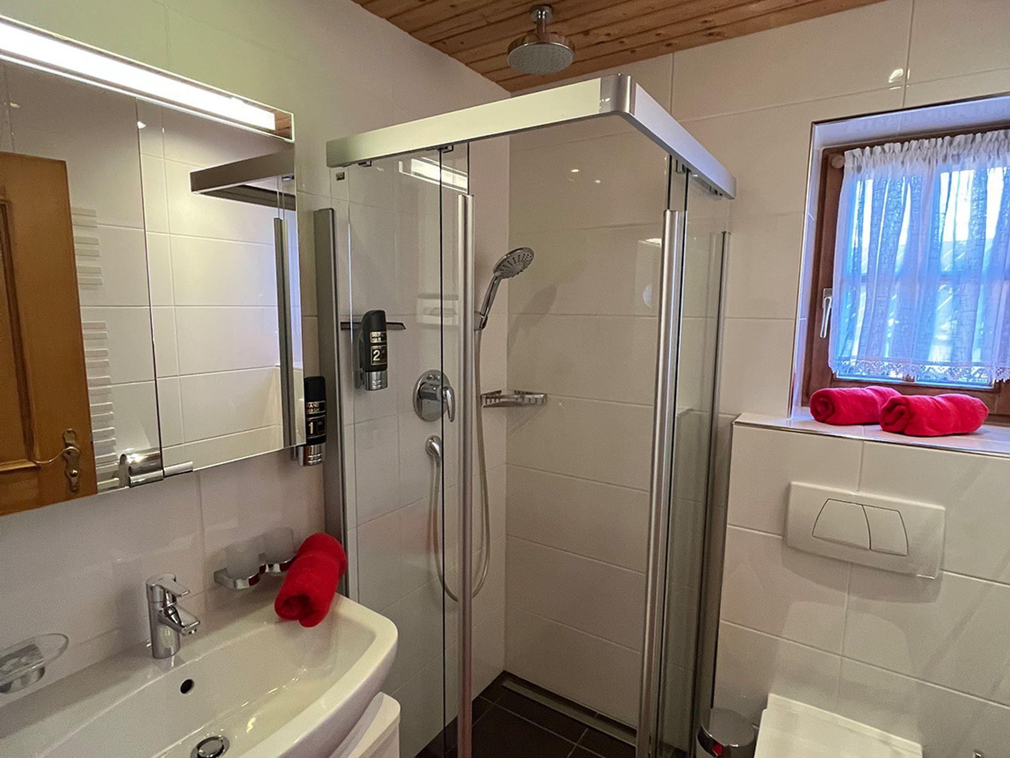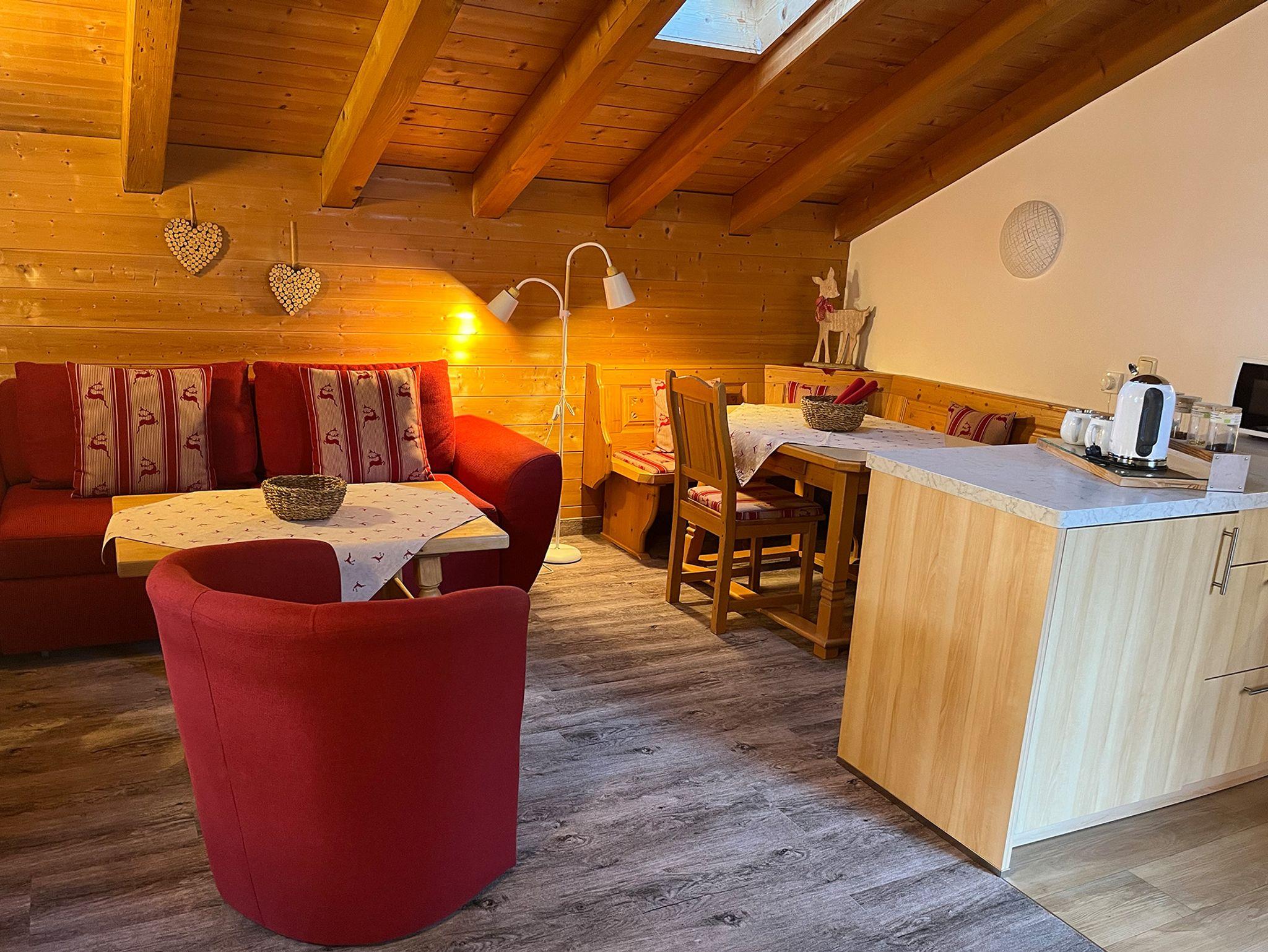Unsere urgemütliche Ferienwohnung „Alpenrose“ hat ein großes Wohnzimmer mit Essecke und Schlafcouch und eine neue große Eck-Küchenzeile mit Geschirrspüler, 4-Platten-Ceranfeld und Backrohr, Kühlschrank mir Gefrierfach, Mikrowelle, Wasser- und Eierkocher, Toaster, Kaffeemaschine, Bio-Teestation, Flachbildschirm 107 cm, CD-Player, 1 separates Schlafzimmer mit Bandscheibenmatratzen und Bettwäsche, 1 neues Bad mit ebenerdiger Dusche und WC, Handtücher, Fön, Seifen- und Duschgelspender, Kosmetiktücher und Toilettenpapier, Flur, 2 große Balkone mit Blick auf die Berge.
