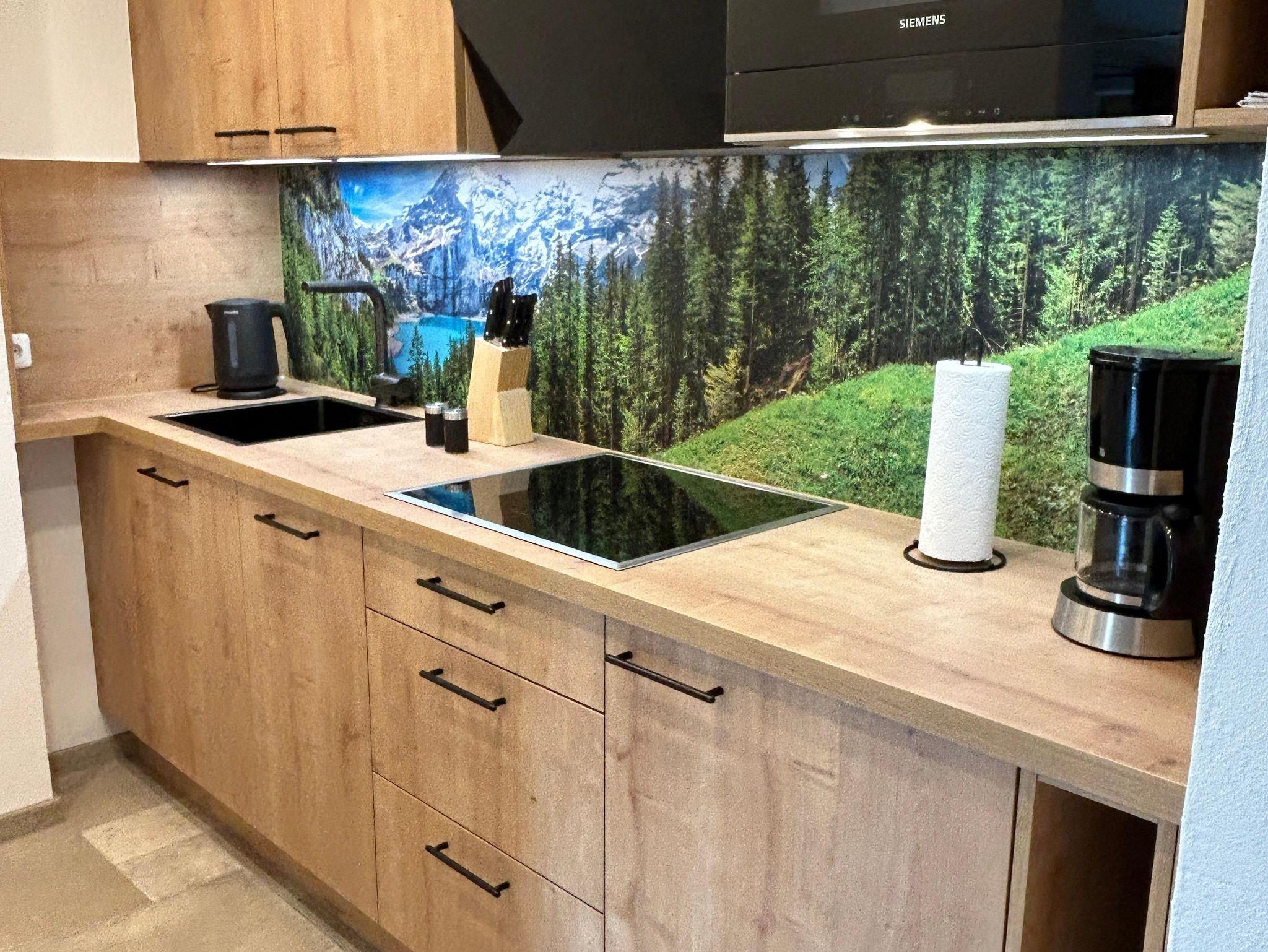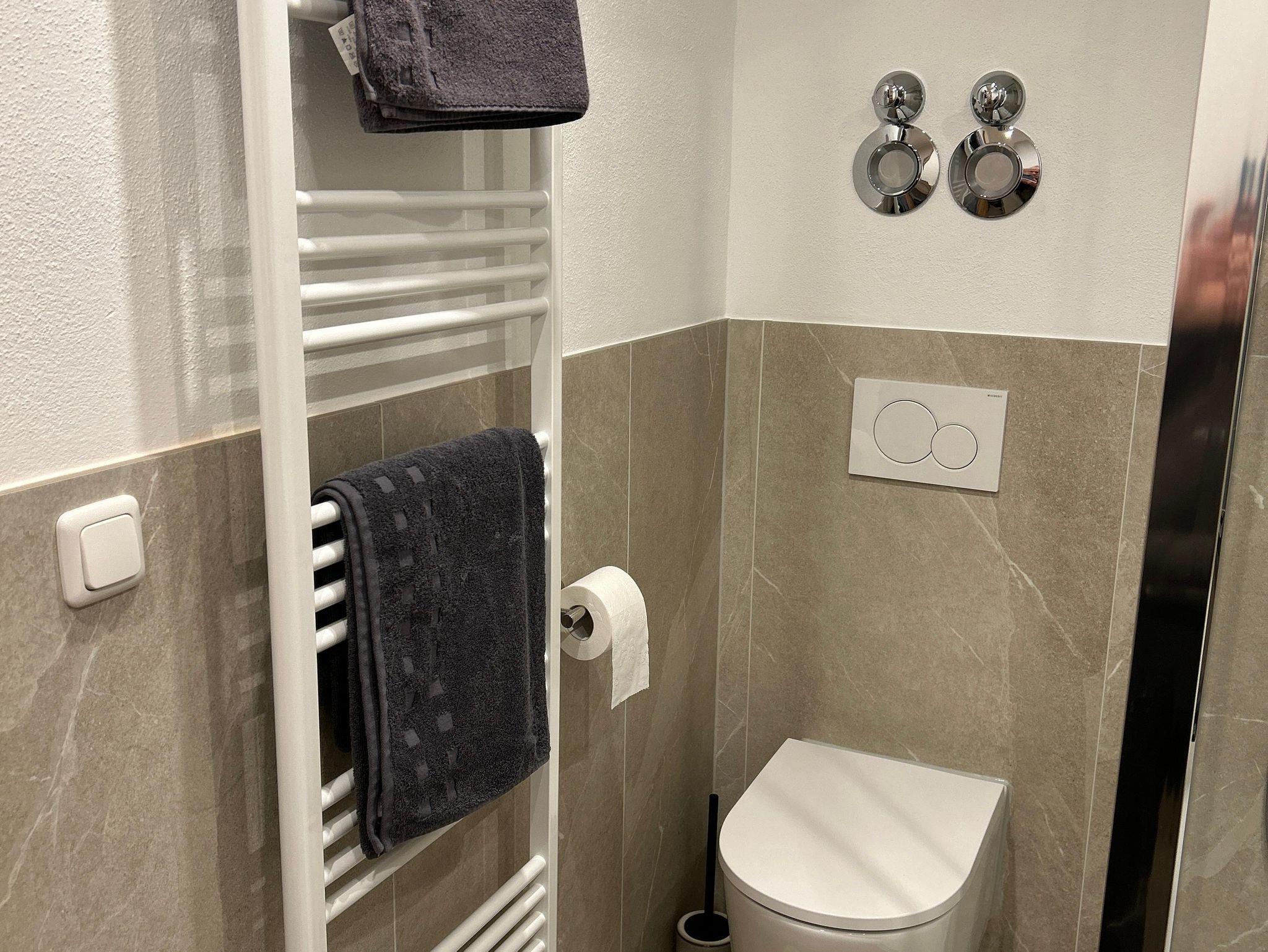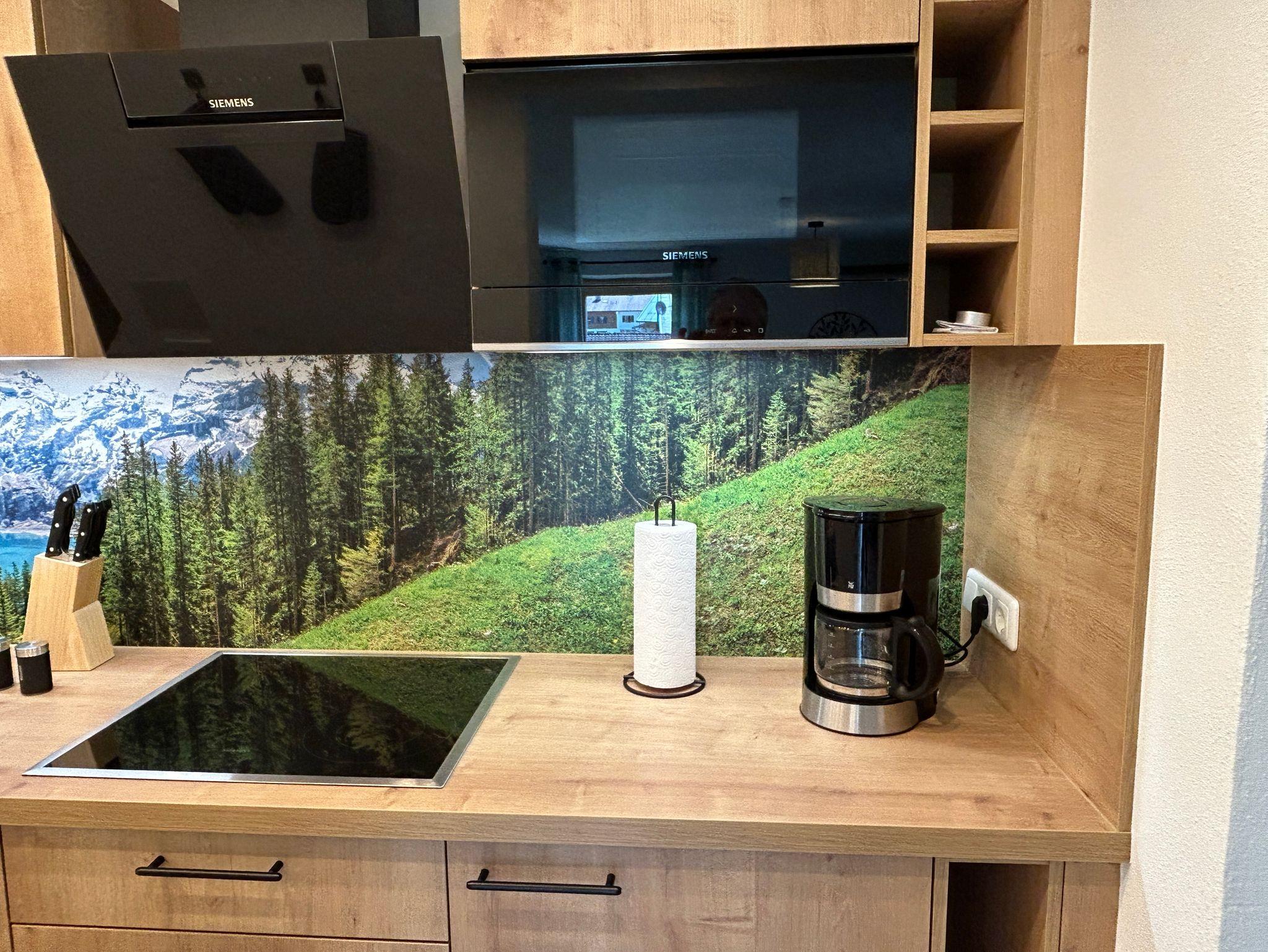 Die licht- und sonnendurchflutete Ferienwohnung Watzmann besitzt einen extra großen Ost-(Morgensonne) und Südbalkon (Mittagssonne) . Darüber hinaus können Sie im Erdgeschoß eine einladende Terrasse zum Entspannen nutzen. Im offenen Wohnbereich lädt eine gemütliche Couch und ein großer Flachbild-TV (50 Zoll) zum Verweilen ein. Die mit Fußbodenheizung versehene Küche ist mit hochwertigen Geräten voll ausgestattet. Sie verfügt über ein Ceranfeld, Dunstabzugshaube, Spülmaschine, Kühlschrank mit Tiefkühlfach und einer Mikrowelle mit Grillfunktion. Ebenso enthält sie Kaffeemaschine, Wasserkocher und Toaster. Das Schlafzimmer ist durch eine massive Schiebetür vom Wohnbereich abgetrennt, verfügt über ein Kingsize-Bett (180 x 200 cm) und einen Kleiderschrank. Für einen besseren Schlafcomfort sorgen lichtdichte Wabenplissees an Fenster und Balkontür. Im Badezimmer befindet sich eine Fußbodenheizung, eine große Duschkabine mit Regendusche, eine Handtuchheizung sowie WC und Waschtisch. Kostenloses WLAN ist im gesamten Wohnbereich verfügbar.