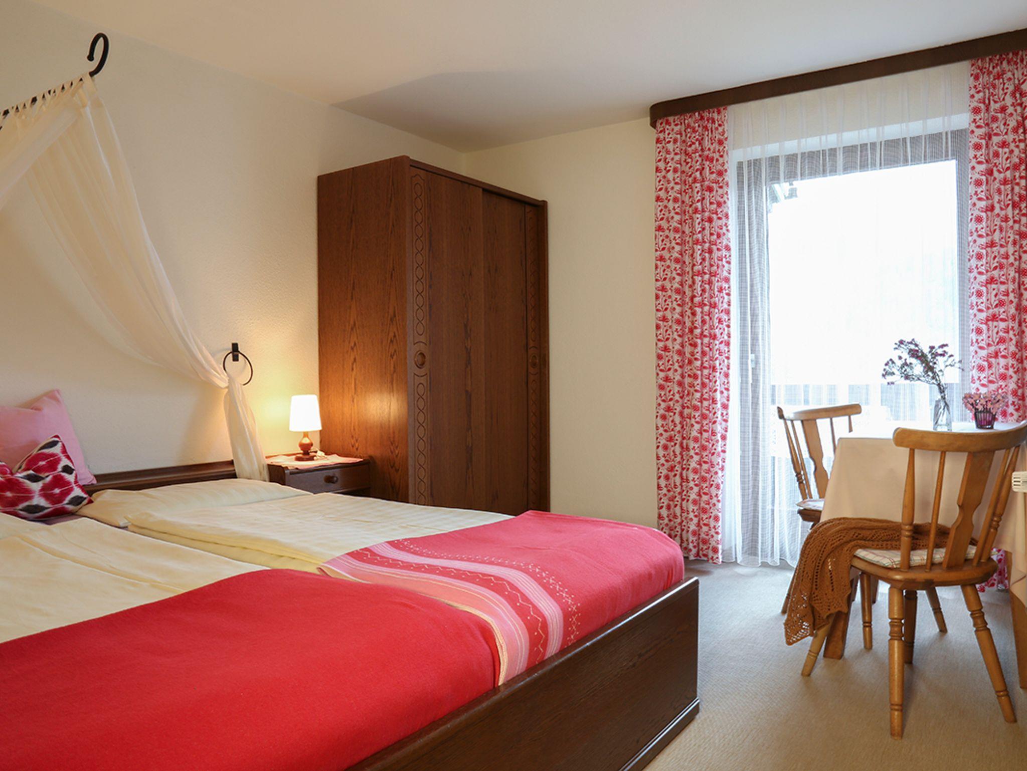 Behagliches Doppelzimmer mit Dusche/WC und Balkon mit Blick auf die grandiose Berchtesgadener Bergwelt.
