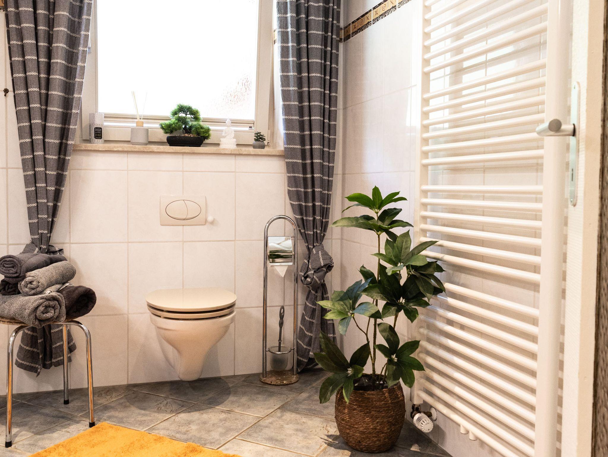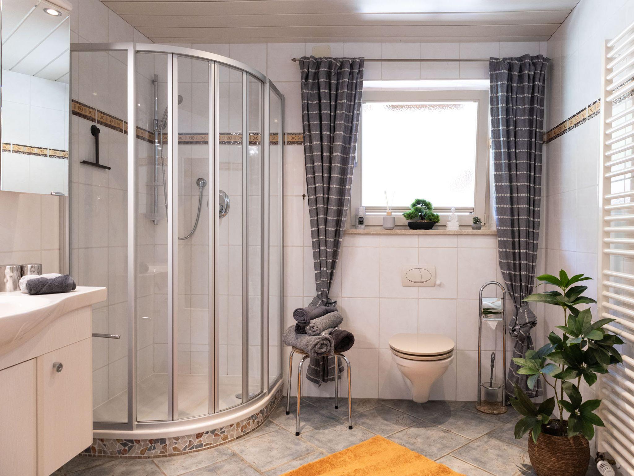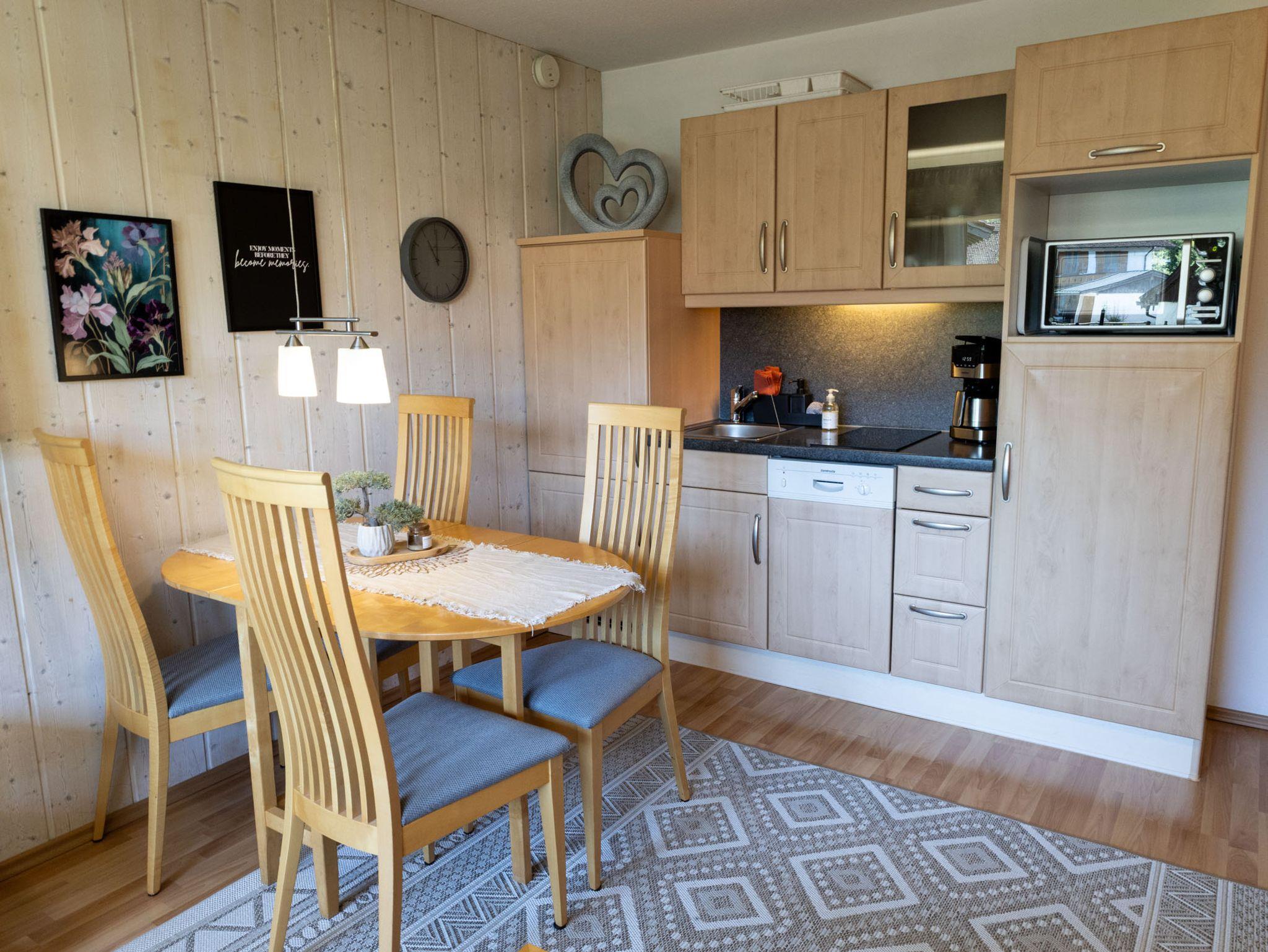 Die großzügige Küche ist mit einem Geschirrspüler, Mikrowelle, Kühlschrank, Kaffeemaschine, Wasserkocher und sämtlichen Kochutensilien ausgestattet. Der große Esstisch lädt zum Frühstück oder auch abends zu einer zünftigen Brotzeit ein. Das gemütliche Ecksofa und der Flachbild-TV runden das komfortable Wohnzimmer ab.