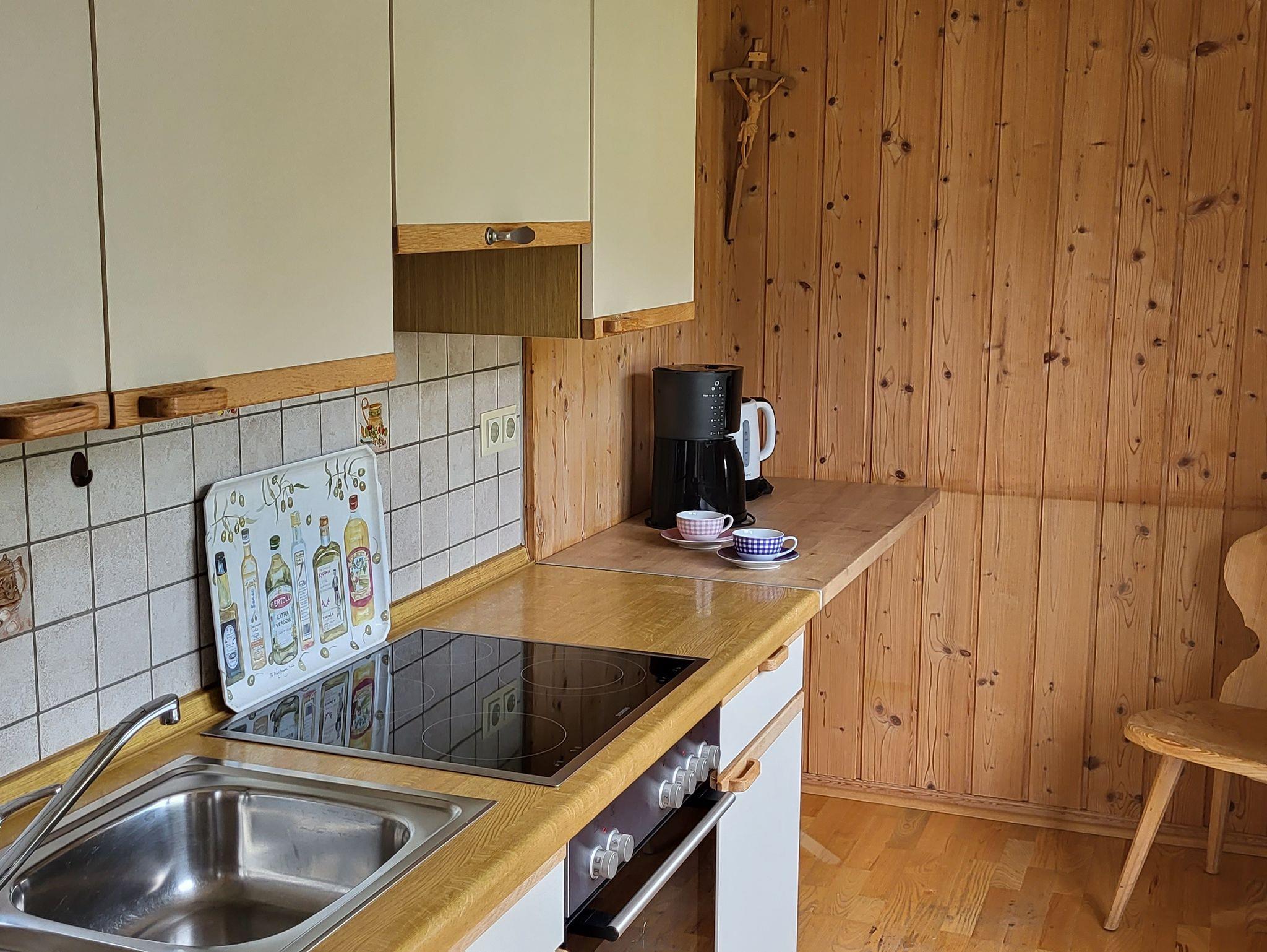 Unsere Nichtraucher-Ferienwohnung liegt im Obergeschoß und bietet auf 50 qm Platz. Sie ist ausgestattet mit einem separatem Schlafzimmer mit Doppelbett, einer Küche (Herd, Backofen, Kühlschrank, Wasserkocher, Kaffeemaschine), einem Wohnzimmer mit einer gemütlichen Sitzgruppe, TV, einem Bad mit Dusche/WC wo Fön und Handtücher bereitgestellt sind. Auf dem möblierten Balkon genießen Sie die Aussicht auf das herrliche Gebirgspanorama.