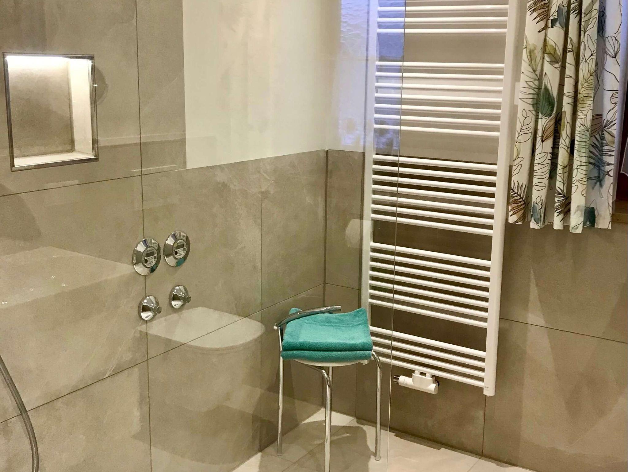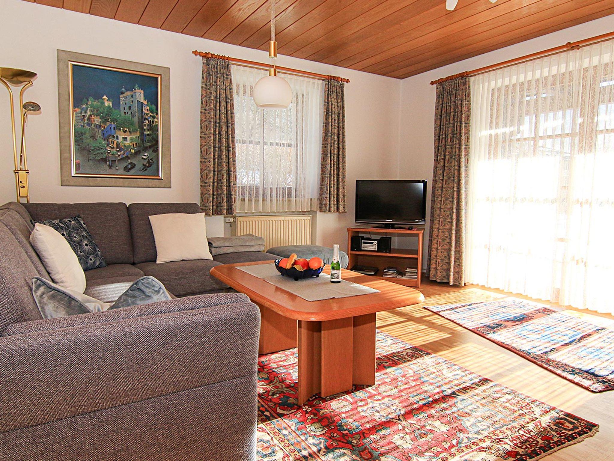 Die Ferienwohnung befindet sich im Erdgeschoß des Hauses und ist für 2 - 4 Personen konzipiert. Sie hat eine Größe von 58 qm und besteht aus Wohnzimmer, Schlafzimmer, Küche mit Essecke, Dusche/WC und einer Diele. Im Wohnzimmer befindet sich eine eingebaute Schrankwand mit 2 Klappbetten für die 3. und 4. Person. Die Räumlichkeiten sind äußerst komfortabel eingerichtet, u.a. mit hochwertigen Einbaumöbeln, einem großen SAT-TV, Radio. Zur Wohnung gehört außerdem eine großzügige Terrasse mit einem herrlichen Bergblick und angrenzender Liegewiese.
