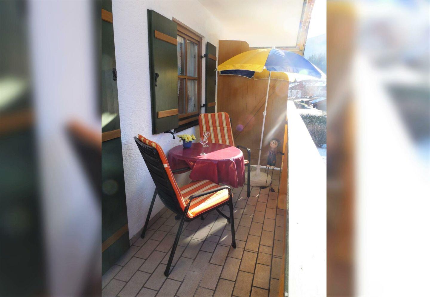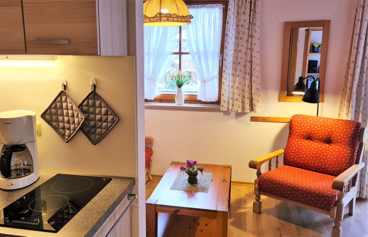 Die gemütliche kleine Wohnung im ersten Obergeschoss verfügt über eine kleine Küchenzeile, eine gemütliche Essecke mit uriger Eckbank, eine gemütliche Sitzecke und ein separates Schlafzimmer. Vom sonnigen möblierten Balkon genießen Sie das herrliche Bergpanorama.
