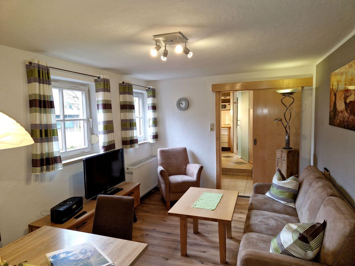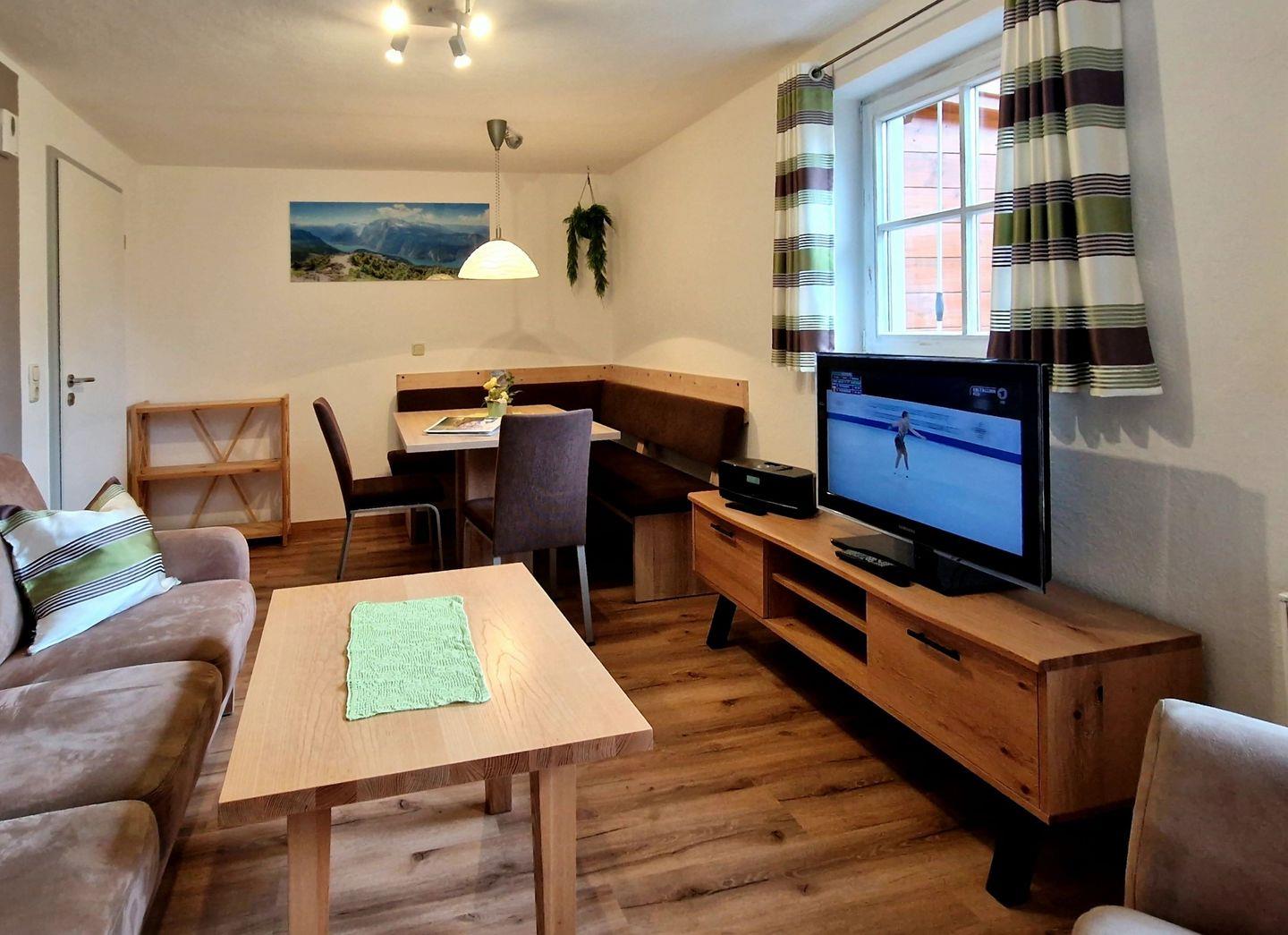 Willkommen im Turmhaus – Ihrem gemütlichen Rückzugsort in unmittelbarer Nähe des Königssees! Dieses liebevoll gestaltete Ferienhäuschen bietet auf 60 qm ein einzigartiges Wohngefühl und ist perfekt für Familien. Das Turmhaus erstreckt sich über zwei Etagen. Im Erdgeschoss erwarten Sie ein gemütliches Wohnzimmer mit Sofaecke und Essbereich, eine voll ausgestattete Küche mit Geschirrspüler sowie ein modernes Badezimmer mit ebenerdiger Dusche. Über eine Treppe gelangen Sie ins Obergeschoss, wo sich zwei Schlafzimmer mit komfortablen Boxspringbetten befinden. Das hintere Schlafzimmer im charmanten Türmchen bietet eine ganz besondere Atmosphäre, ist aber nur über das vordere Schlafzimmer erreichbar. Zwischen den Schlafzimmern befindet sich ein kleiner Durchgang mit offener Kleideraufbewahrung sowie ein separates WC mit Waschbecken. Eines der Schlafzimmer verfügt zudem über einen Fernseher. Ein besonderes Highlight ist die eigene möblierte Terrasse, von der aus Sie einen herrlichen Blick auf den Hohen Göll und den Jenner genießen können. Ob ein entspanntes Frühstück im Freien oder ein geselliger Grillabend – hier können Sie Ihren Urlaub in vollen Zügen genießen. Auf dem weitläufigen Grundstück können sich Kinder frei bewegen, während die Eltern auf der Liegewiese entspannen. Sonnenliegen, ein Spielplatz, eine Tischtennisplatte sowie ein kleiner Fitnessraum mit Kickertisch stehen allen Gästen kostenfrei zur Verfügung. Im Winter sind sogar Schlitten vorhanden. Zwei E-Ladestationen sowie Waschmaschine und Trockner inkl. Waschmittel stehen gegen Gebühr bereit. Zwei kostenfreie Parkplätze direkt am Haus runden das Angebot ab.