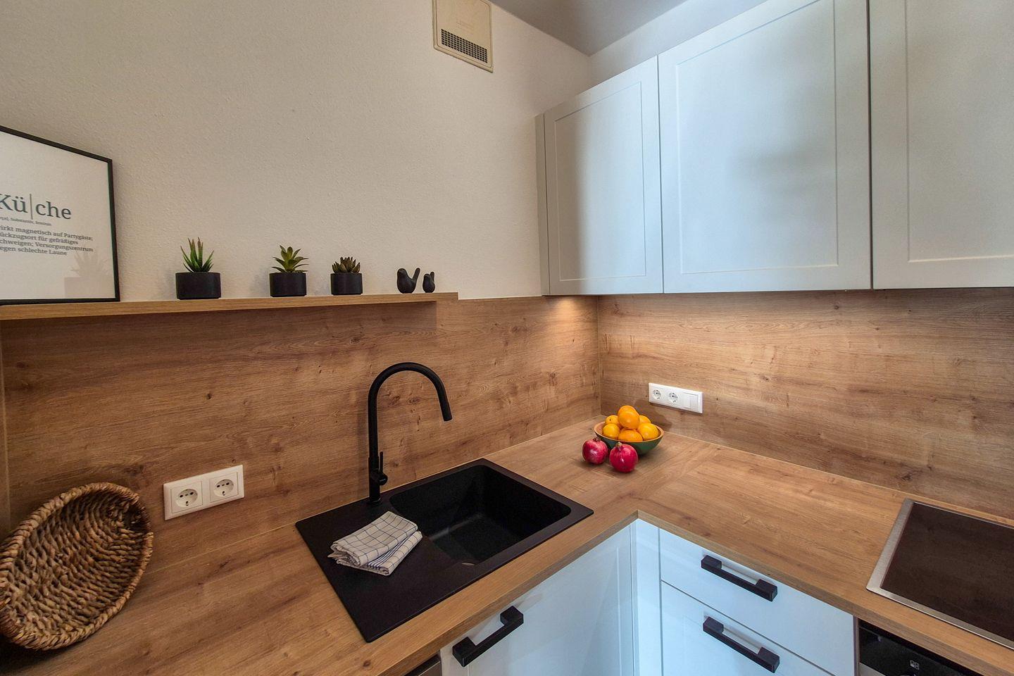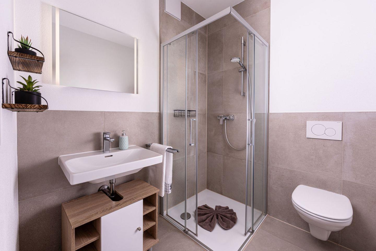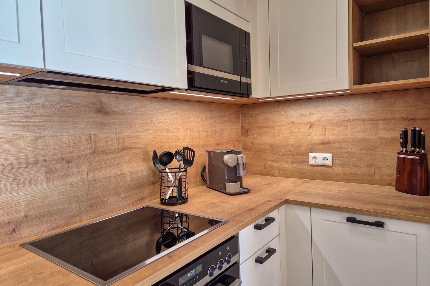 Das separate Schlafzimmer ist mit einem komfortablen Doppelbett und Kleiderschrank ausgestattet. Im gemütlichen Wohnzimmer laden eine bequeme Sofaecke mit Flachbild-TV und ein Esstisch zum Verweilen ein. Die voll ausgestattete Küche bietet alles, was Sie zum Kochen und Genießen brauchen – von Ceranherd, Backofen und Spülmaschine bis hin zu Mikrowelle, Kühlschrank mit Gefrierfach, Kaffeemaschine, Nespresso-Maschine, Wasserkocher und Toaster. Das moderne Bad verfügt über eine ebenerdige Dusche, WC und Haartrockner.