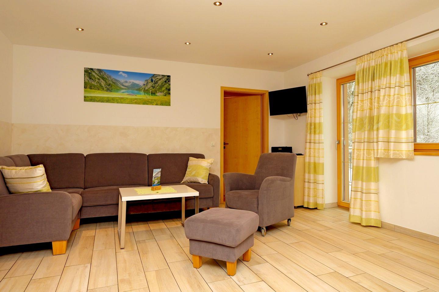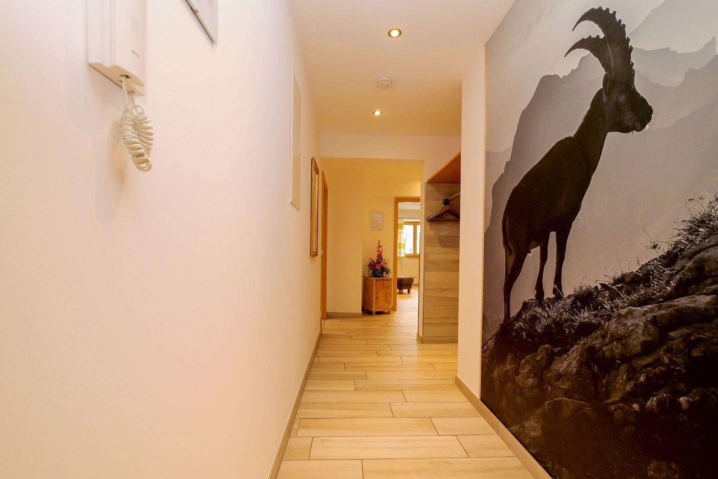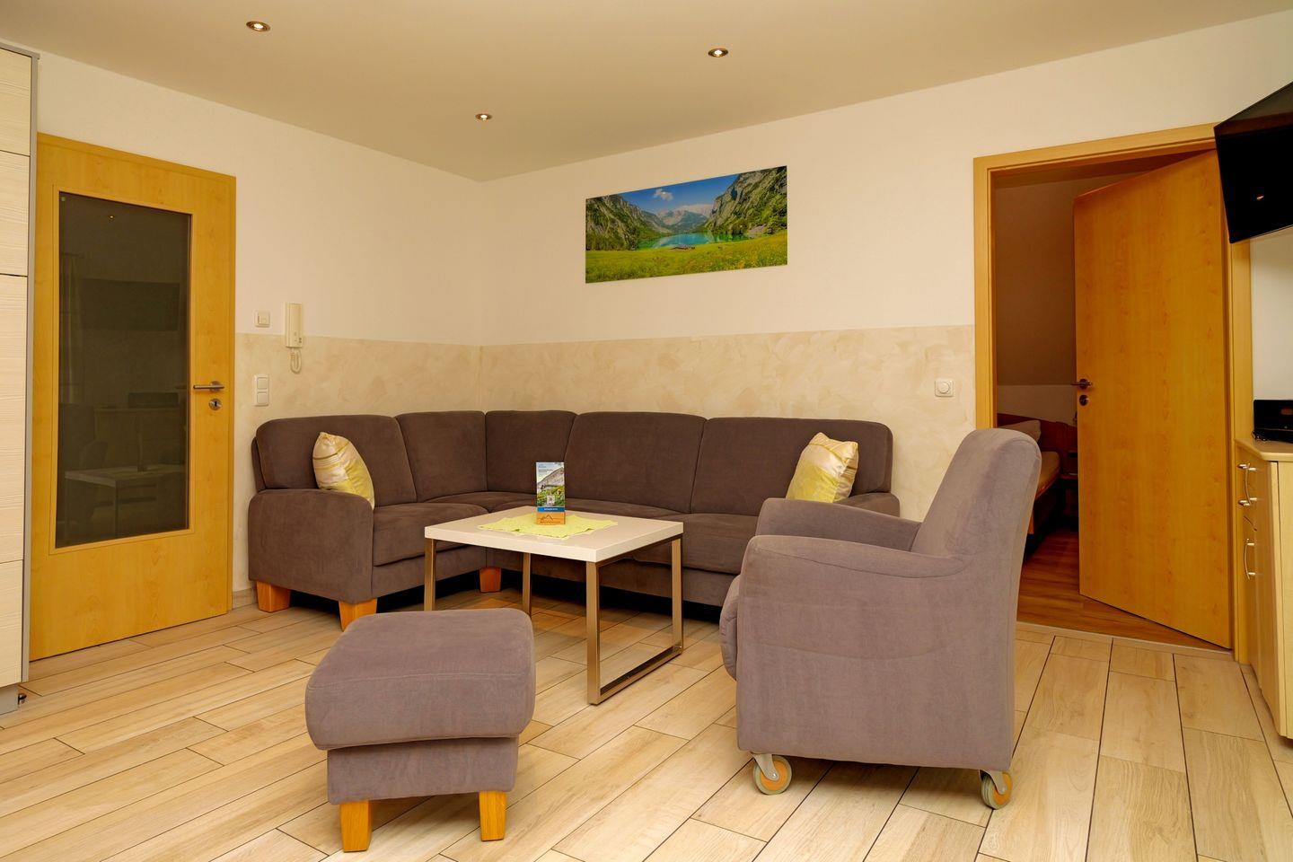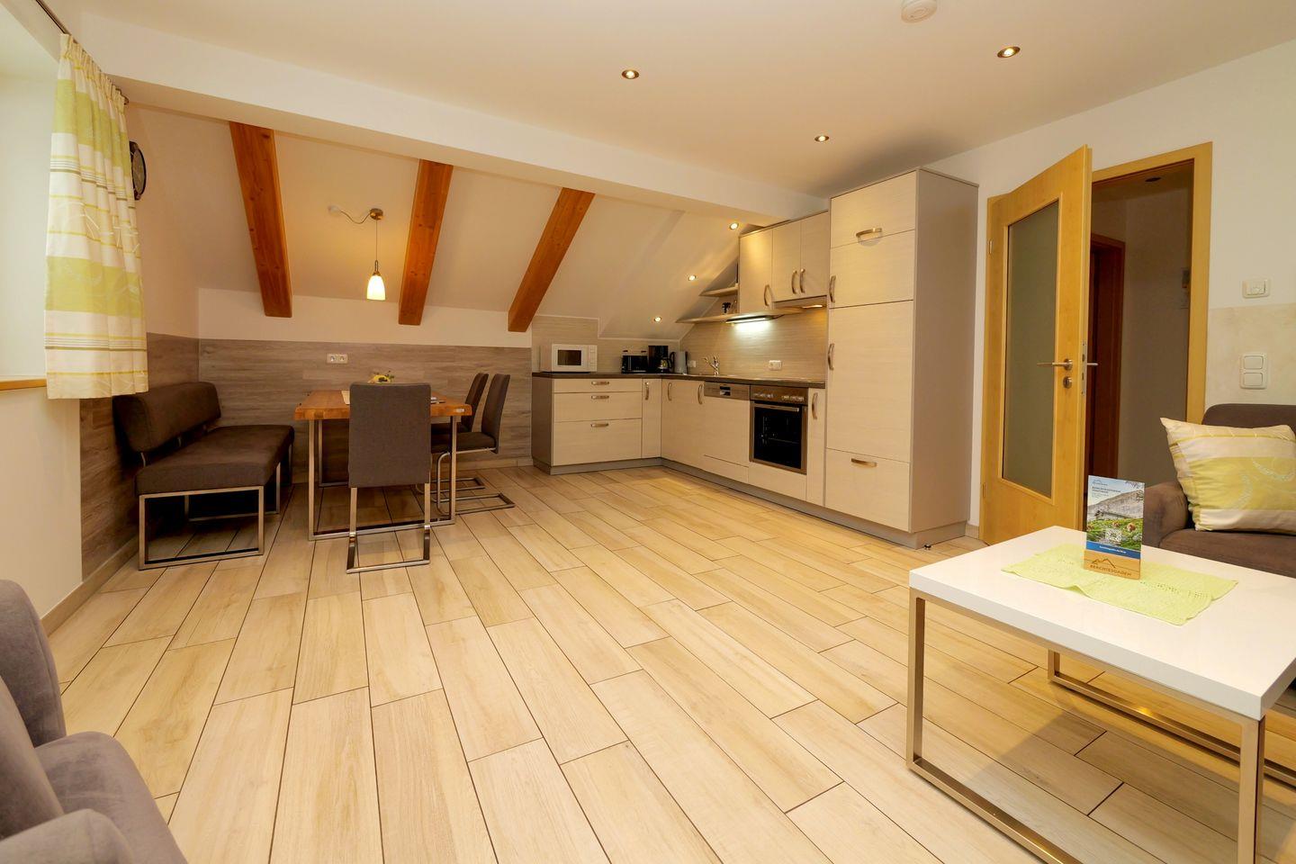 Die Ferienwohnung liegt im 2. Stock und verfügt über drei separate Schlafzimmer mit sechs Schlafmöglichkeiten. Zwei moderne Badezimmer sowie ein zusätzliches Gäste-WC sorgen für hohen Komfort. Die Ausstattung lässt keine Wünsche offen: Die offene Küche grenzt direkt an das Wohnzimmer und ist vollständig eingerichtet mit Ceranherd, Backofen, Mikrowelle, Kühlschrank, Spülmaschine, Kaffeemaschine, Wasserkocher, Toaster, Geschirr und sämtlichen Küchenutensilien. Ein Essbereich mit Esstisch lädt zu gemeinsamen Mahlzeiten ein, während die gemütliche Sofaecke zu entspannten Stunden vor dem TV einlädt. Besonders hervorzuheben ist der einladende Balkon, von dem aus Sie einen weiten Ausblick auf die umliegende Alpenlandschaft genießen können.