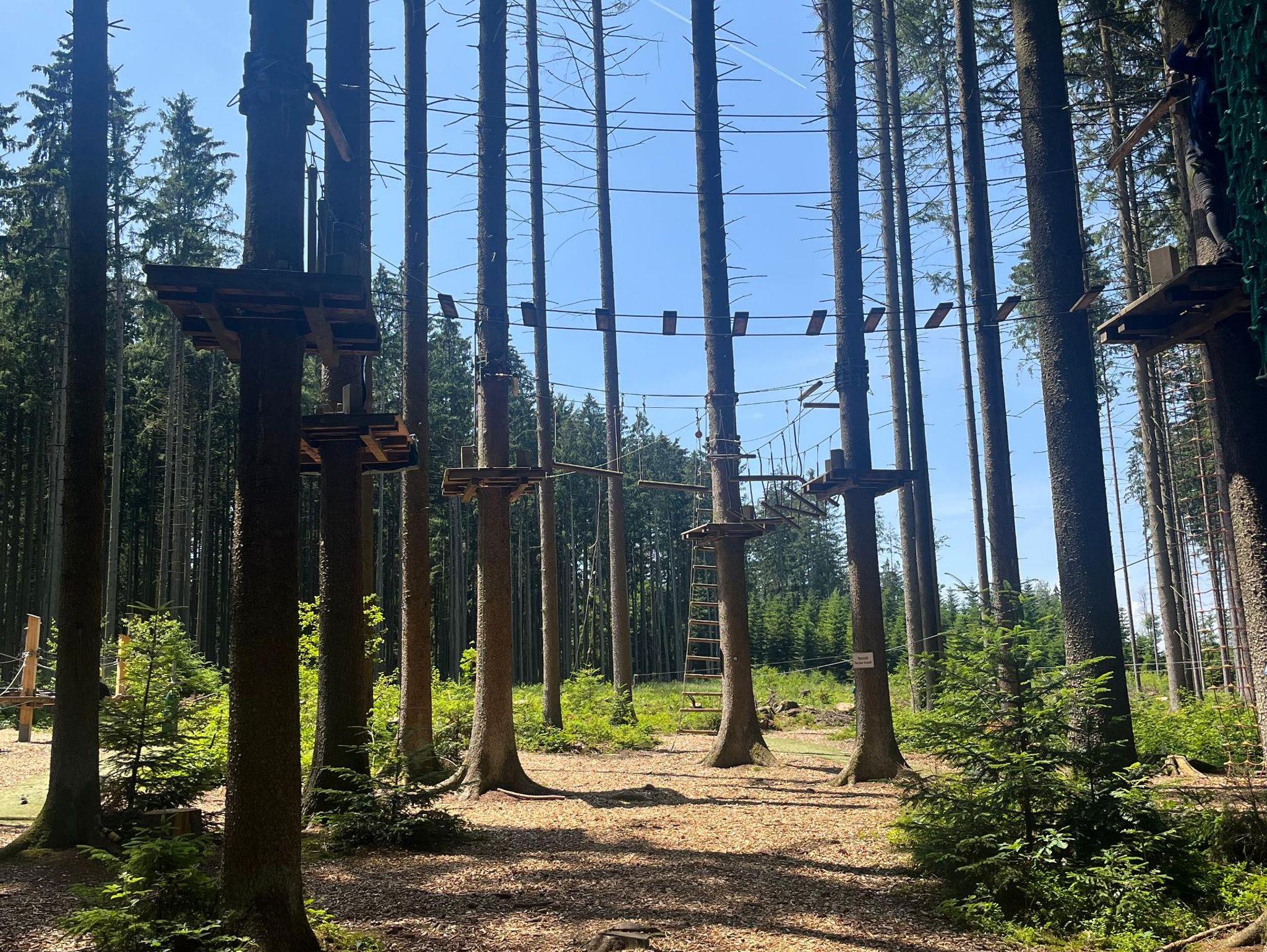 Heidi ist direkt am Waldrand an einem Hang gelegen. Von hier hat man einen herrlichen Ausblick zum Kletterpark, da der Flying Fox direkt am Haus vorbeiführt. Der Zugang zum Haus erfolgt nicht über eine Treppe, sondern einen Aufgang, mit dem man das Haus auch mit Kinderwagen erreichen kann. Ein Doppelbett und ein Etagenbett bietet hier bis zu vier Personen Platz. Jedes Baumhaus ist mit einer kleinen separaten Toilette mit einem Handwaschbecken und Gästehandtuch ausgestattet. Duschmöglichkeit am Minigolfkiosk vorhanden.