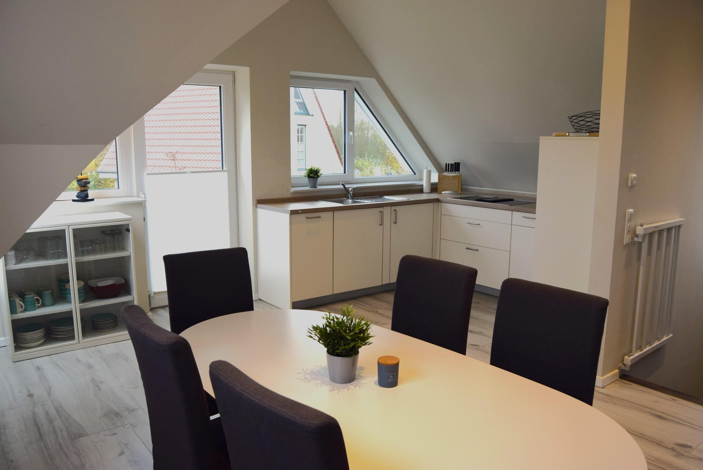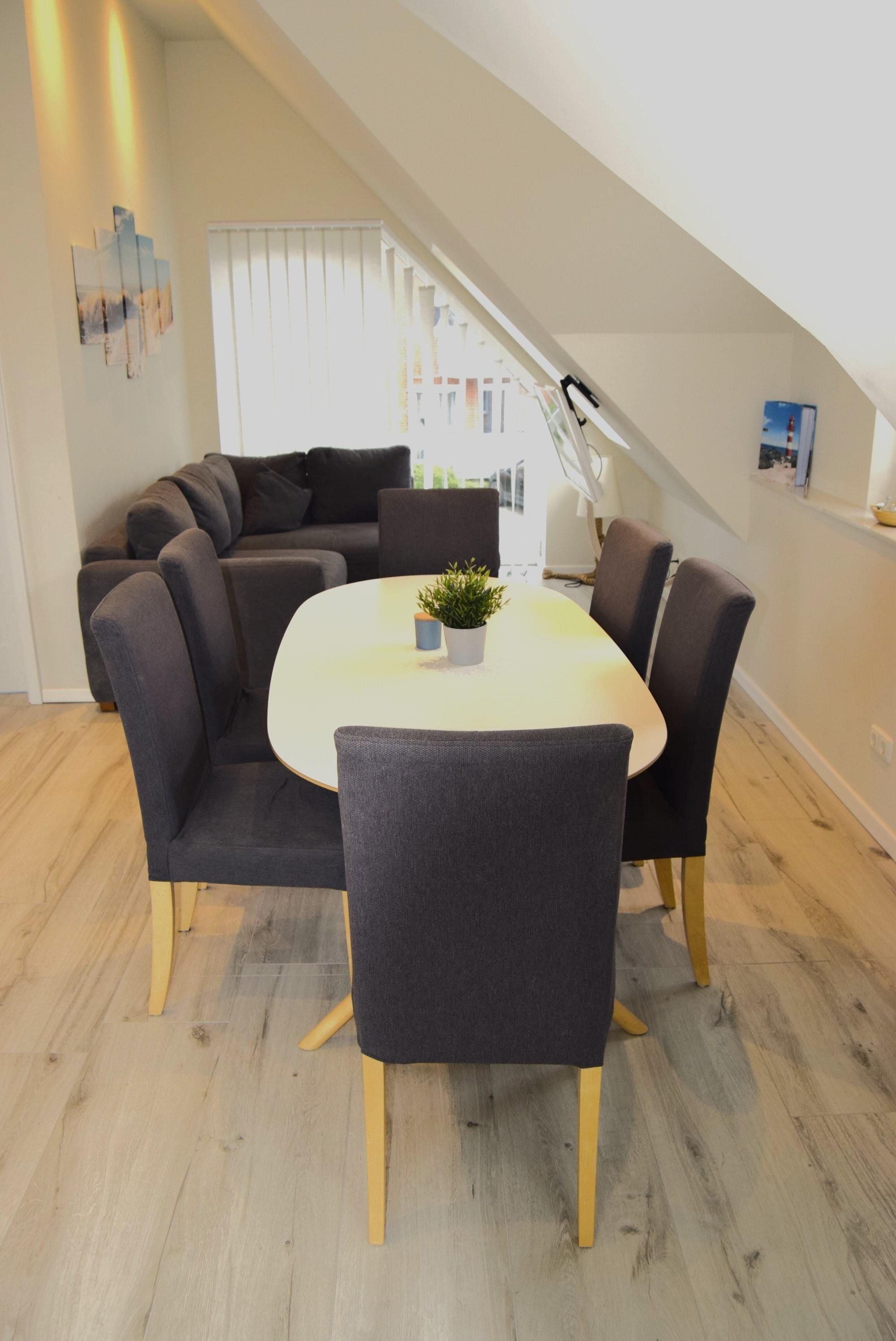 In unserem schönen Ferienhaus "Haus Stüürmann" direkt hinter dem Deich ist das die tägliche Erholung. Die großen Fenster sorgen für ein lichtdurchflutetes Obergeschoss mit Wohnzimmer, Essbereich und offener Küche für geselliges Beisammensein.