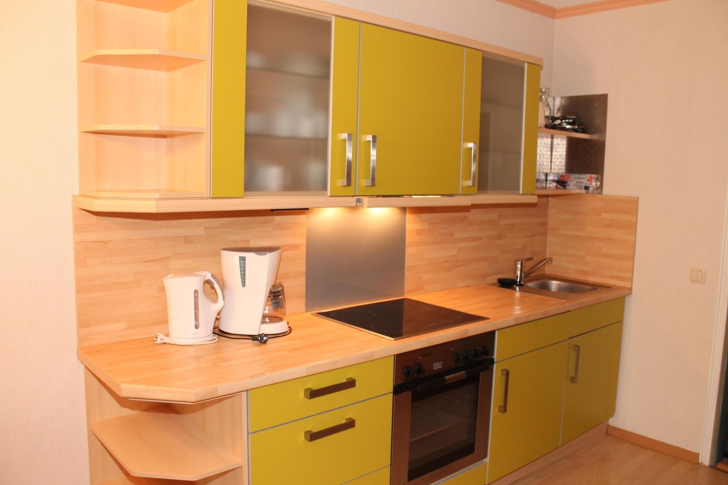 Die Küchenzeile ist zum Wohn- und Schlafraum hin offen gestaltet. Hier steht Ihnen neben einem Herd mit vier Platten auch ein Backofen, ein Kühlschrank sowie Wasserkocher, Toaster und weitere Küchenutensilien zur Verfügung.