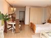 Durch die durchdachte Möblierung des Raumes bietet das Hauptzimmer der Wohnung zusätzlich zu Sitzgelegenheiten und Doppelbett Platz für einen Runden Esstisch mit vier Stühlen.