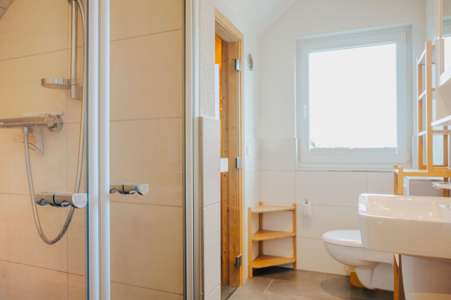 Die Sauna, in einem von zwei Badezimmern, und der Holzofen im Wohnzimmer bieten auch im Winter Gemütlichkeit und lassen direkt Urlaubsfeeling aufkommen.