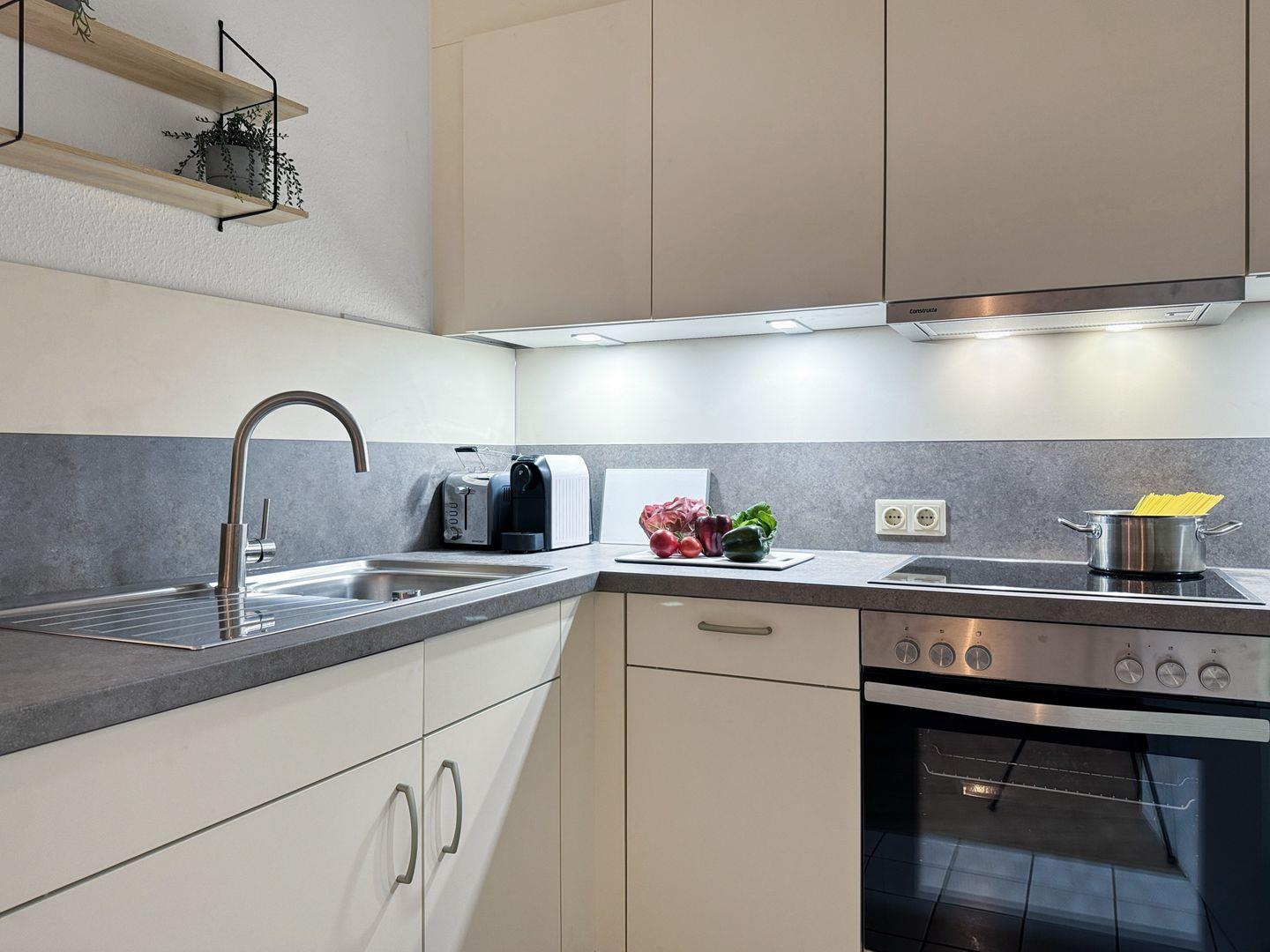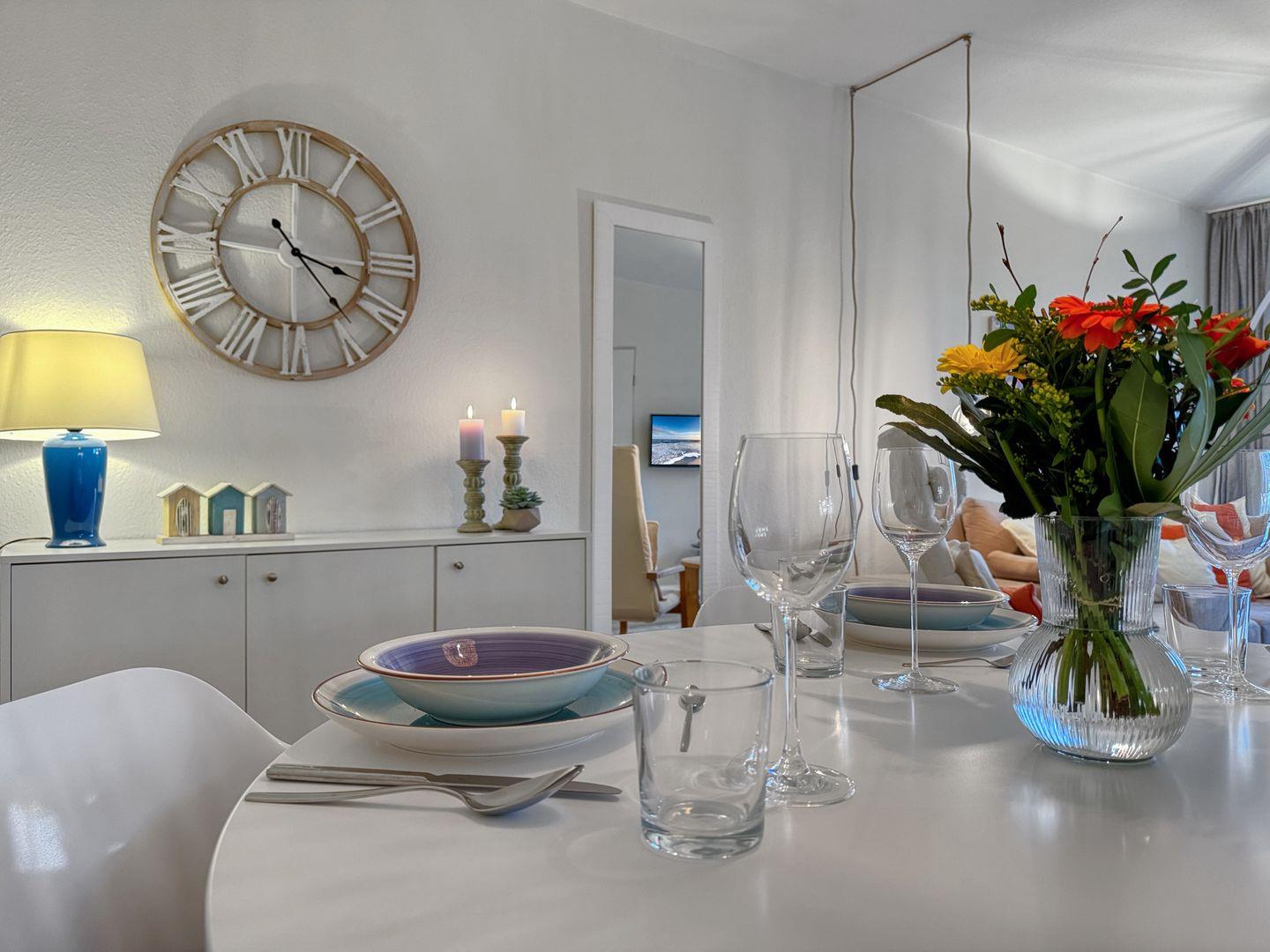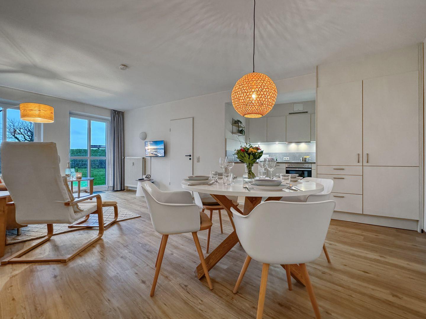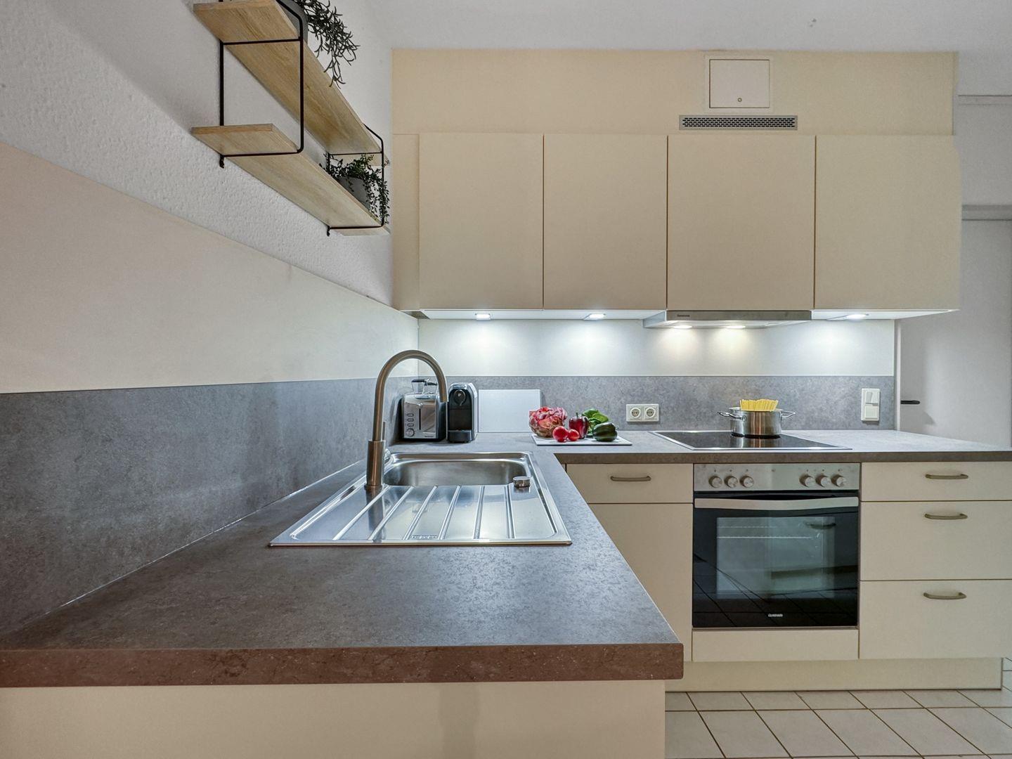 Die Wohnung verfügt über eine voll ausgestattete, offene Küche, in der Sie die Möglichkeit haben, selbst zu kochen. Ausgestattet mit einem modernen Herd, Backofen, Geschirrspüler und Kühlschrank stehen Ihnen alle Annehmlichkeiten zur Verfügung, um Ihre kulinarischen Fähigkeiten auf die Probe zu stellen. Der Essbereich bietet Ihnen Platz, um gemeinsam zu essen und den Tag Revue passieren zu lassen.