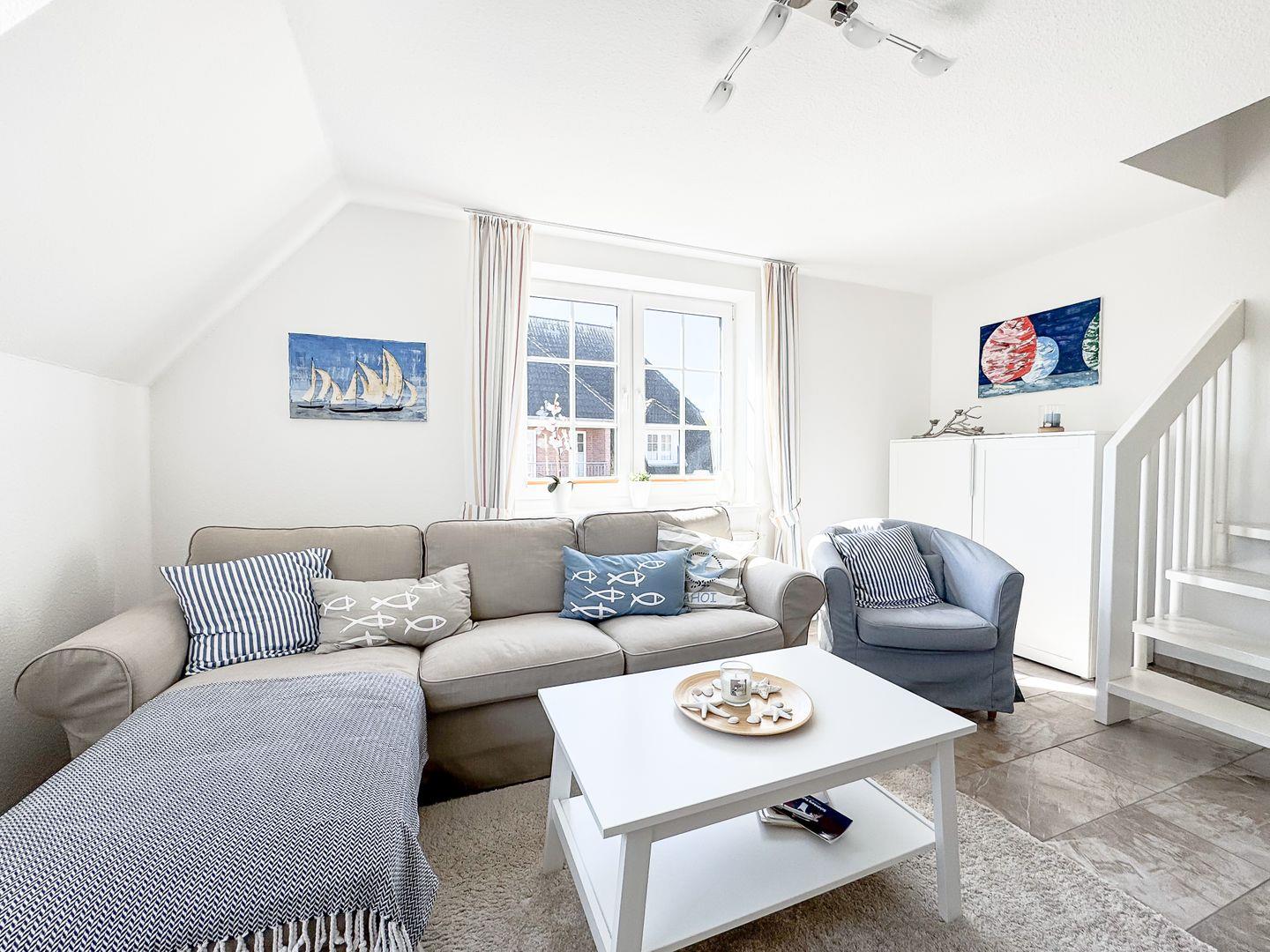 Die Wohnung erstreckt sich über zwei Etagen und besticht durch eine durchdachte Raumaufteilung. Im ersten Stock erwartet Sie ein helles, einladendes Wohnzimmer mit einer komfortablen Sofaecke, einem Essbereich und einem großen, überdachten Balkon. Hier können Sie bei einem Glas Wein entspannen und den Blick ins Grüne genießen. Die offene Küche ist mit modernen Geräten wie einem Kühlschrank, einem Geschirrspüler, einer Espressomaschine und einem 4-Platten-Herd ausgestattet, sodass Sie auch im Urlaub köstliche Gerichte zaubern können. Die beiden gemütlichen Schlafzimmer im 2.OG laden nach einem erlebnisreichen Tag zum Ausruhen ein und sind ideal, um neue Energie zu tanken.