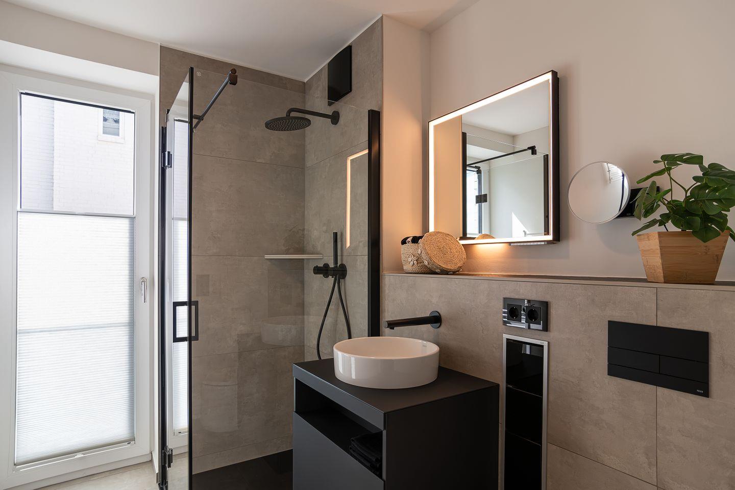 Das Badezimmer ist modern gestaltet und bietet Ihnen alles, was Sie für Ihren Komfort benötigen. Für eine behagliche Atmosphäre sorgt die Heizung, die auch in den kühleren Monaten für angenehme Temperaturen sorgt.