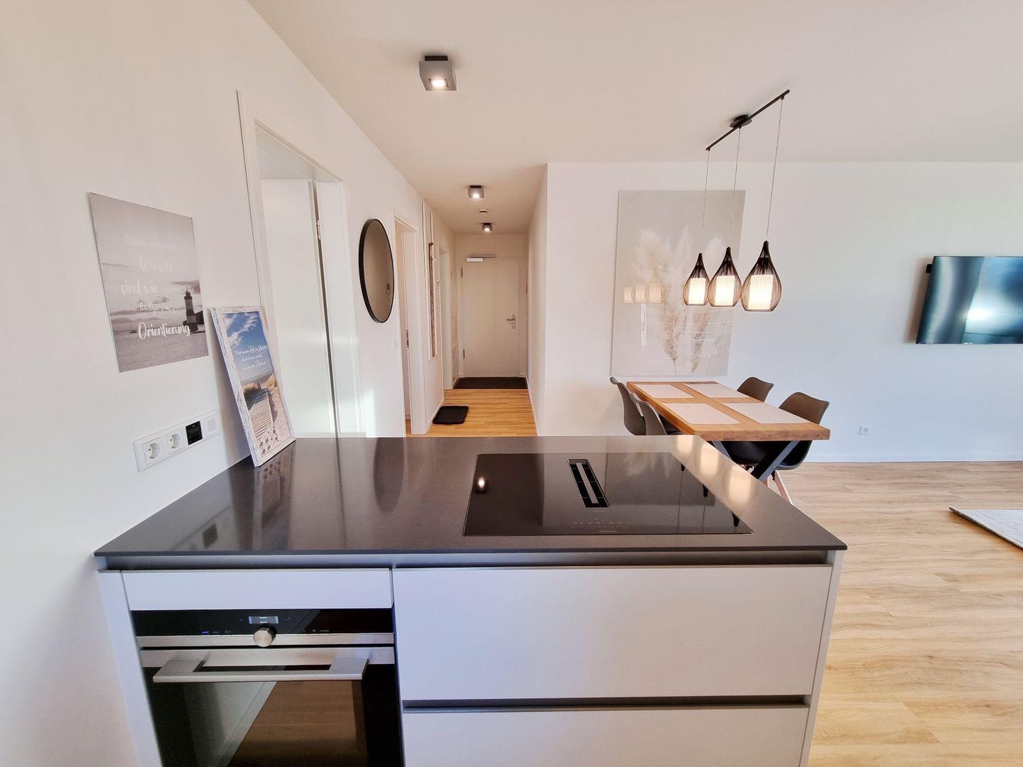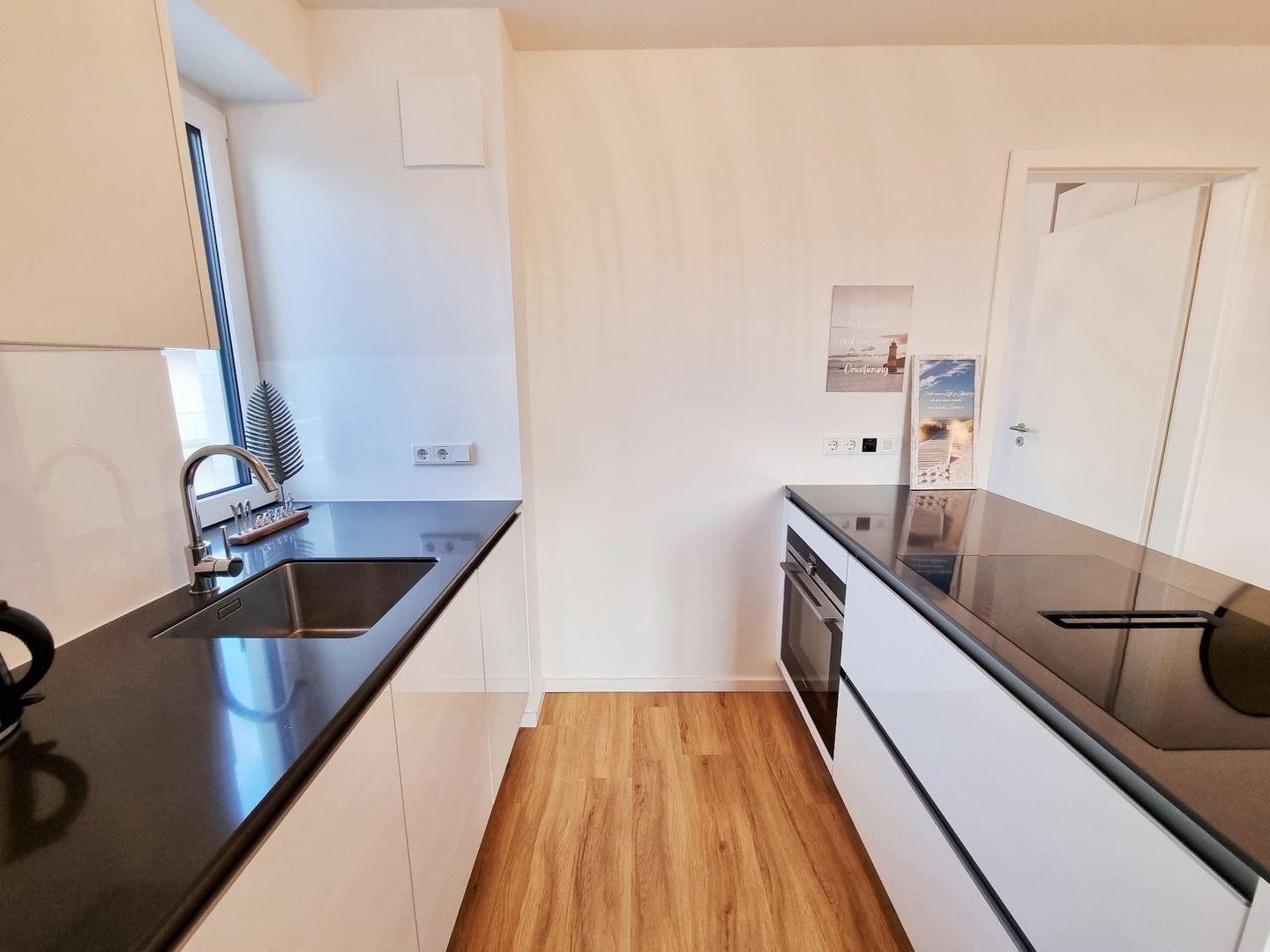 Küche: neue Küche / Dunstabzug in das Induktionskochfeld integriert / Backofen / Geschirrspüler / Filterkaffeemaschine / Wasserkocher / Kühlschrank / Gefrierfach