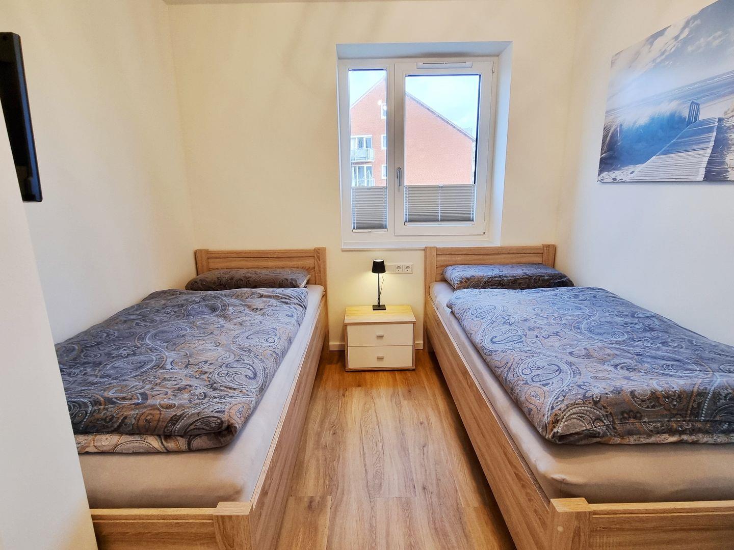 Schlafzimmer II: zwei Einzelbetten / Schrank / Fernseher / Plissee