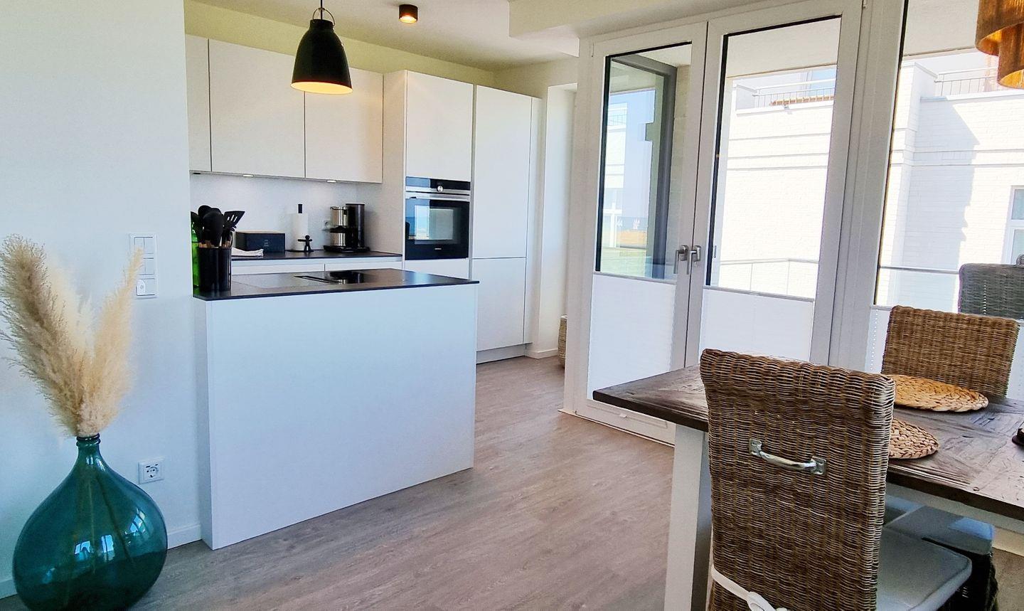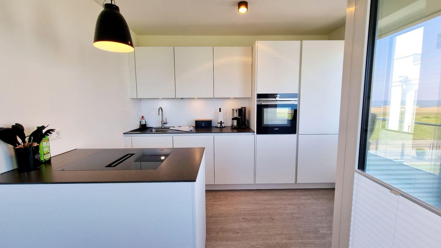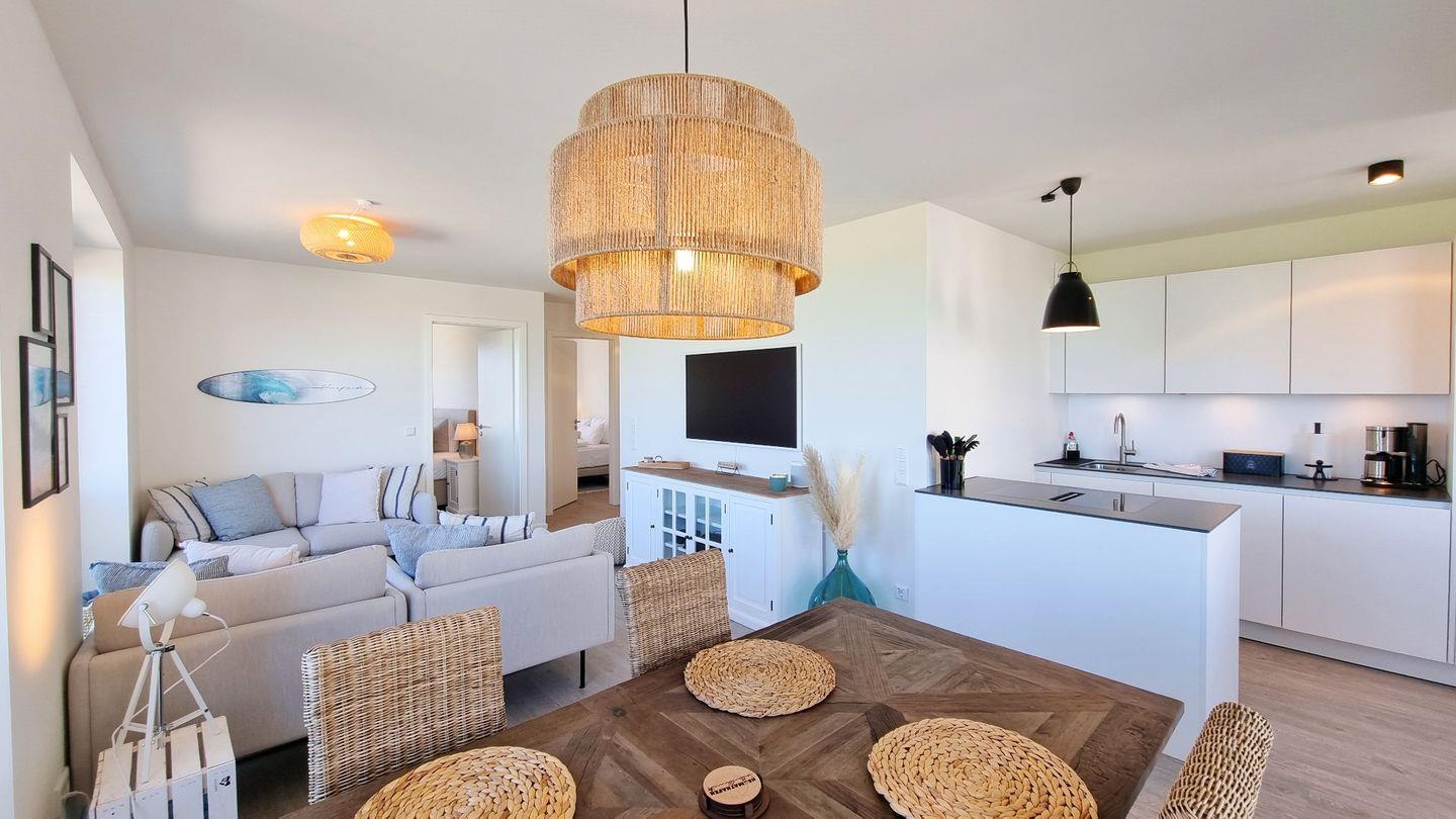 Euch erwartet eine hochwertige und moderne Ausstattung mit Liebe zum Detail. Der helle Wohnbereich besticht durch hochwertige Möbel, die sofortiges Strandflair aufkommen lassen. Die offene Küche ist mit viel Komfort ausgestattet und lädt zum gemütlichen Kochen und Blick aufs Meer ein. Frühstück mit Ausblick auf die Ostsee bietet der Echtholz-Esstisch mit 4 Stühlen. Eine Zweisitzer-Couch nebst zwei bequemen Sesseln, selbstverständlich ebenfalls mit Meerblick, runden den Wohnbereich ab.