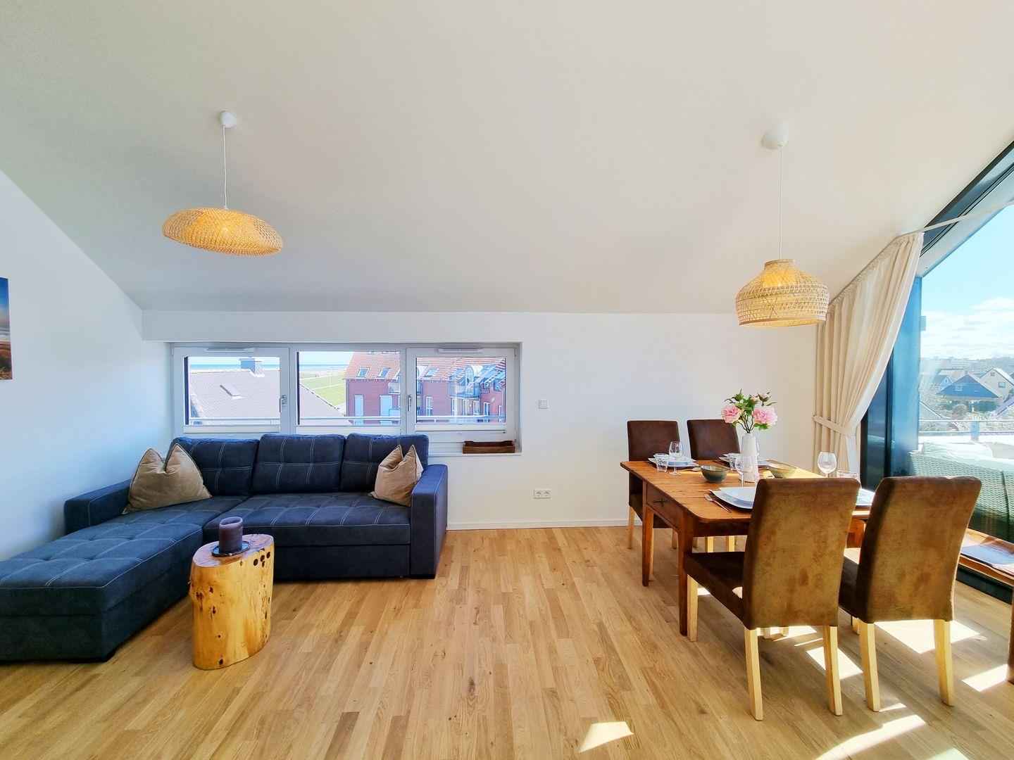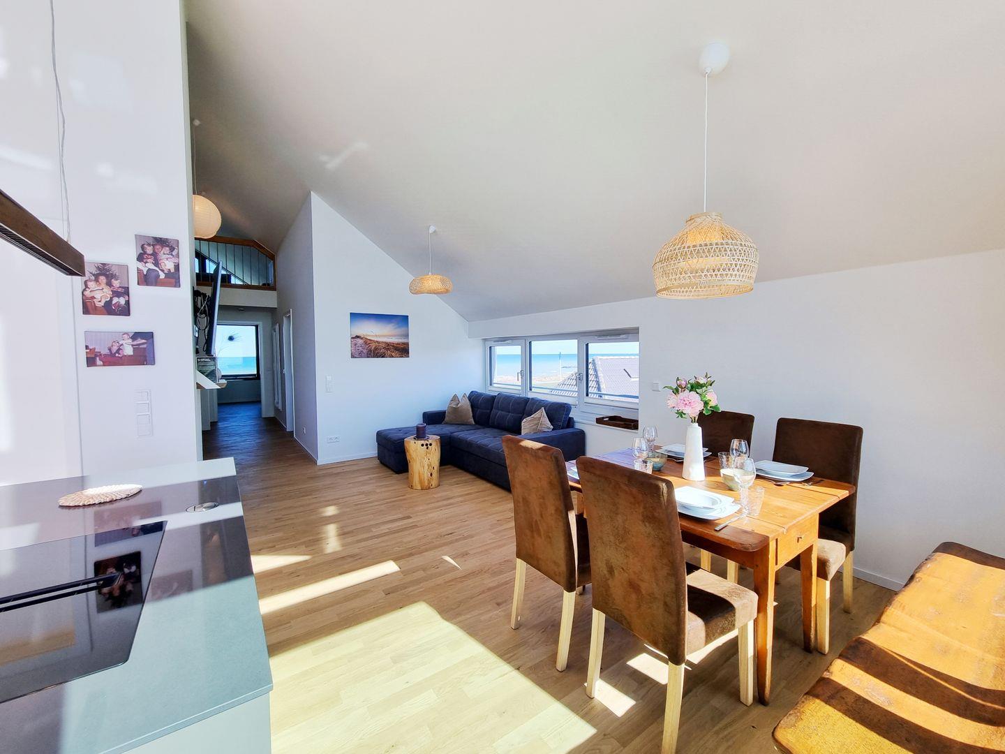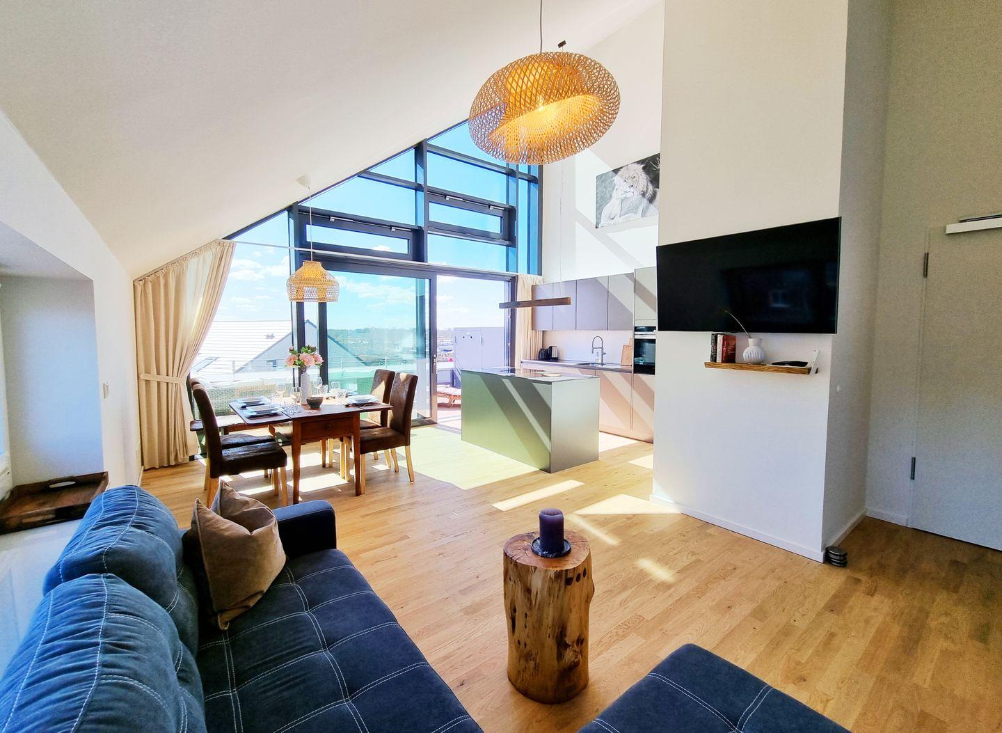 Euch erwarten auf großzügigen 84qm, als Mittelpunkt der Wohnung, der gemütliche Wohn-Essbereich nebst der offenen Küche mit Kücheninsel und Ausgang auf den Sonnenbalkon. Dazu 2 Schlafbereiche (ein Doppelbettzimmer, eins mit Schlafcouch), sowie ein Duschbad und eine zusätzliche Loggia mit schiebbaren Fensterelementen, damit Sie jederzeit den Duft der Ostsee genießen können. Der Wohnbereich ist durch die Balkonseite, die komplett aus Fensterelementen besteh, lichtdurchflutet und hell ist. Selbst durch das Fenster über der Wohnzimmer-Couch ist das Meer zu sehen. Zudem steht eine offene Galerie zur Verfügung, in der es sich ganz wunderbar lesen und erholen lässt, mit dem besten Ausblick, den man sich vorstellen kann. Lasst einfach die Seele baumeln und blickt auf wunderschöne Sonnenaufgänge und Sonnenuntergänge.