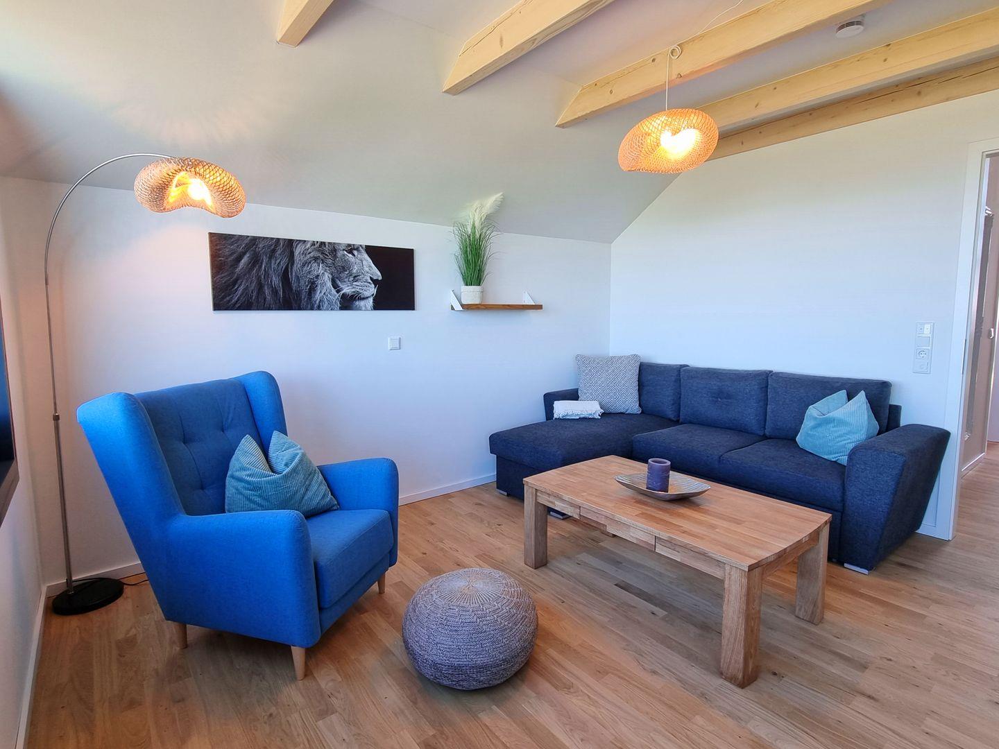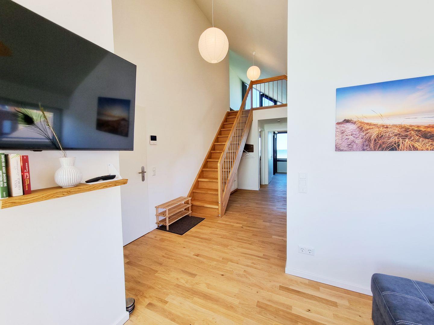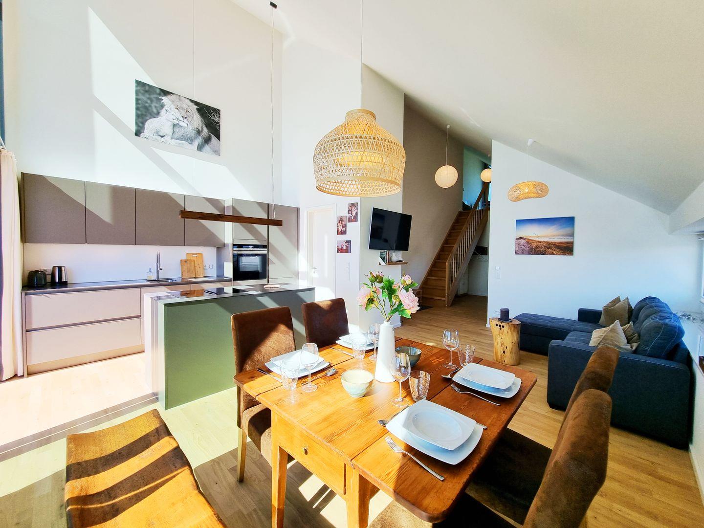 Euch erwarten auf großzügigen 84qm, als Mittelpunkt der Wohnung, der gemütliche Wohn-Essbereich nebst der offenen Küche mit Kücheninsel und Ausgang auf den Sonnenbalkon. Dazu 2 Schlafbereiche (ein Doppelbettzimmer, eins mit Schlafcouch), sowie ein Duschbad und eine zusätzliche Loggia mit schiebbaren Fensterelementen, damit Sie jederzeit den Duft der Ostsee genießen können. Der Wohnbereich ist durch die Balkonseite, die komplett aus Fensterelementen besteh, lichtdurchflutet und hell ist. Selbst durch das Fenster über der Wohnzimmer-Couch ist das Meer zu sehen. Zudem steht eine offene Galerie zur Verfügung, in der es sich ganz wunderbar lesen und erholen lässt, mit dem besten Ausblick, den man sich vorstellen kann. Lasst einfach die Seele baumeln und blickt auf wunderschöne Sonnenaufgänge und Sonnenuntergänge.