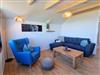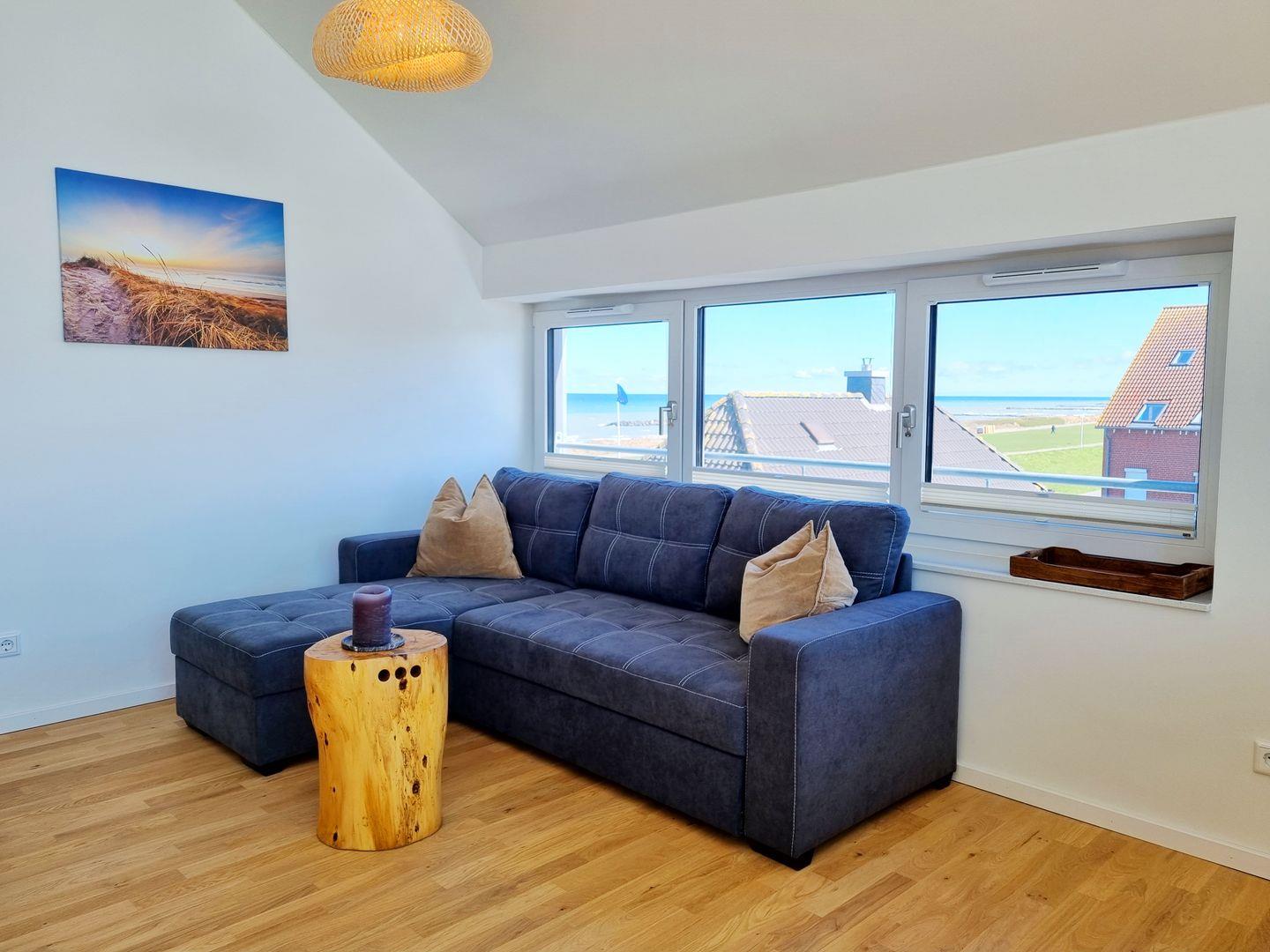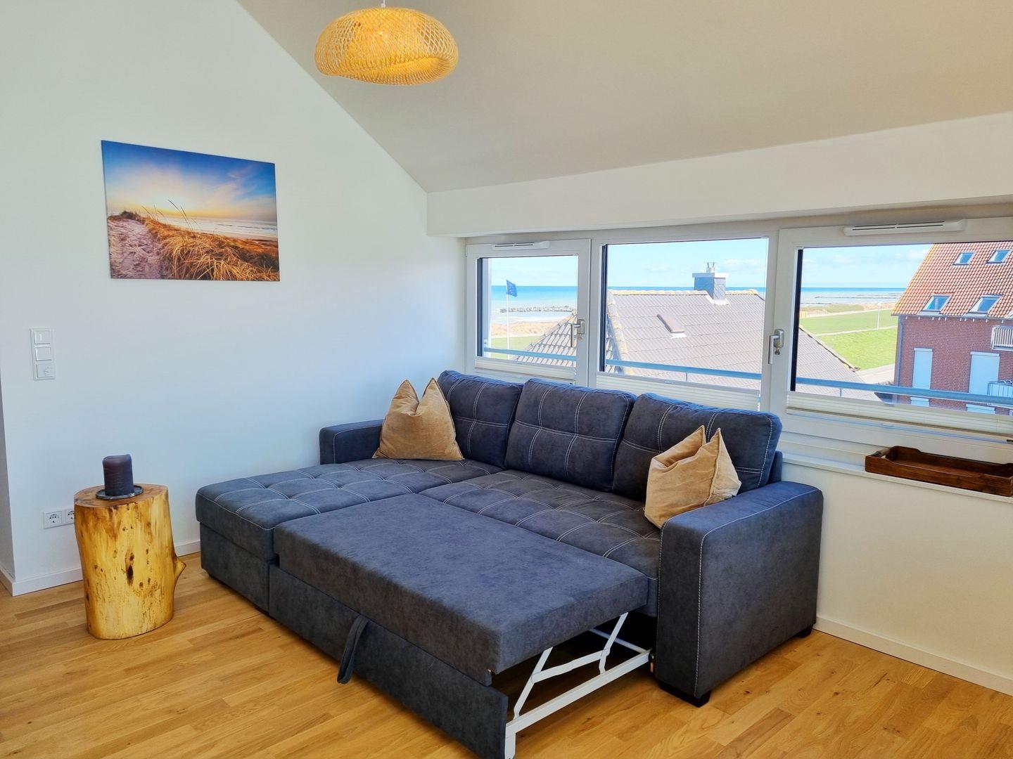 Schlafzimmer I: Schlafcouch / Sessel / Wohnzimmertisch / Plissees / Meerblick / Loggia-Zugang