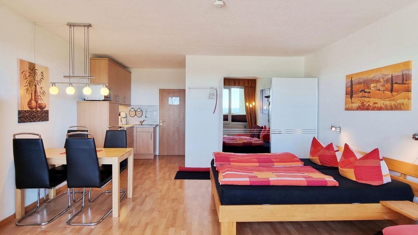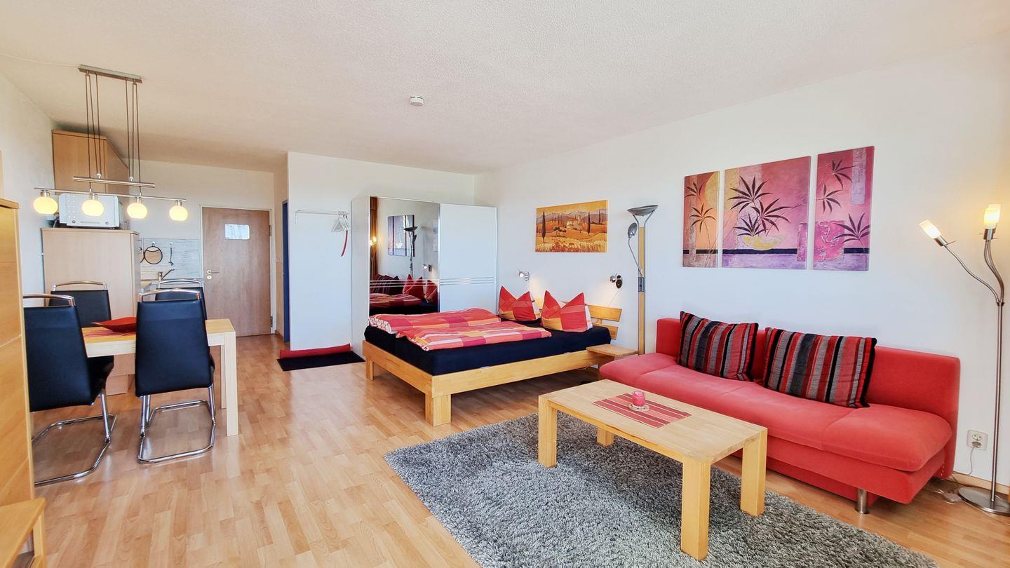 Das farbenfrohe Urlaubsdomizil besticht durch ein offenes Raumkonzept, mit offener Küche, gemütlichem Doppelbett und Wohn-Essbereich mit Fernseher, sowie einem innenliegenden Duschbad. Zum Verweilen lockt die nicht einsehbare Loggia, die sich durch große, komplett öffnende Fenster in einen Balkon verwandeln lässt und einen fantastischen Blick über die Ostsee, die Salzwiesen, die Kieler Förde und an manchen Tagen sogar bis nach Eckernförde bietet. Die Loggia ist gen Westen ausgerichtet, wodurch das Appartement vom frühen Nachmittag, bis zum Anbruch der Nacht sonnendurchflutet ist. Der Ostseestrand ist nach einem gerade einmal 600m kurzen Spaziergang durch die Salzwiesenlandschaft bereits erreicht.