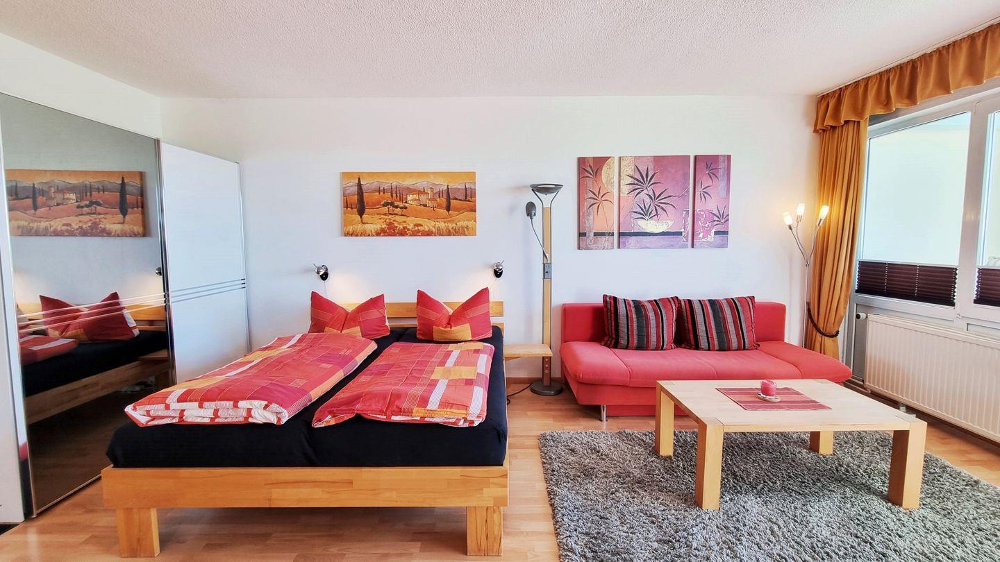 Offenes Schlafzimmer: Doppelbett (180x200) / Schrank mit Spiegelfront