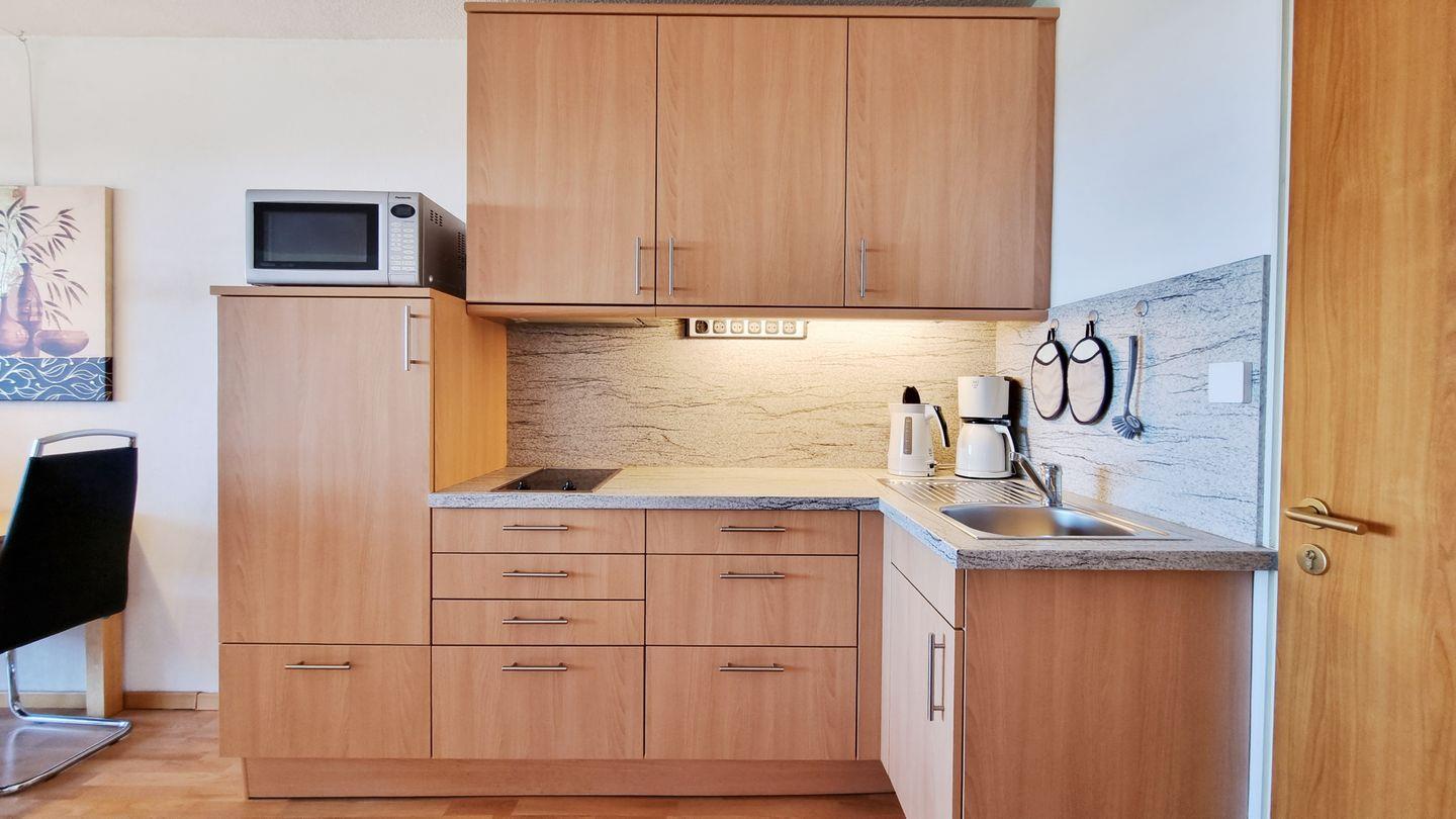 Offene Küche: offene L-Küche / 2-Platten Cerankochfeld / Dunstabzugshaube / Mikrowelle mit integrierter Backofenfunktion / Toaster / Filterkaffeemaschine / Wasserkocher / Kühlschrank mit Gefrierfach
