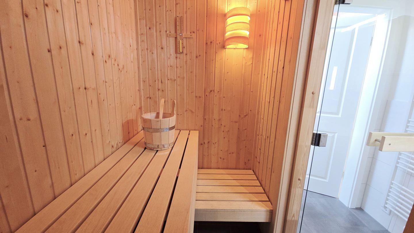 Badezimmer I: ebenerdige Dusche / Waschbecken / WC / Föhn / Handtuchheizkörper / Sauna