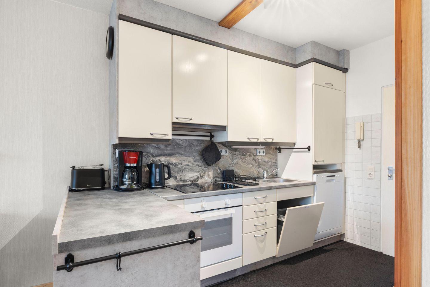 Die Wohnung befindet sich im 1. Stock. Die lichtdurchfluteten Räume sind geschmackvoll eingerichtet und schaffen eine gemütliche Atmosphäre. Der offene Wohnbereich mit einer komfortablen Sofaecke (Schlafcouch mit Liegefläche 140 × 200 cm) lädt zum Entspannen ein und ist mit einem 48-Zoll-Fernseher sowie einer HiFi-Anlage ausgestattet. Ein separates Schlafzimmer, das durch eine verschließbare Tür vom Wohnraum getrennt ist, verfügt über ein Doppelbett (140 × 200 cm).