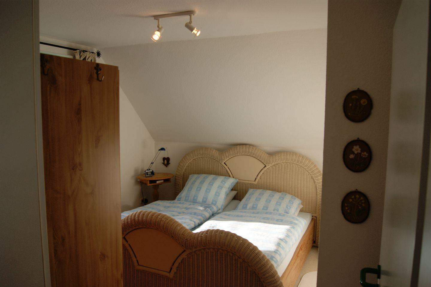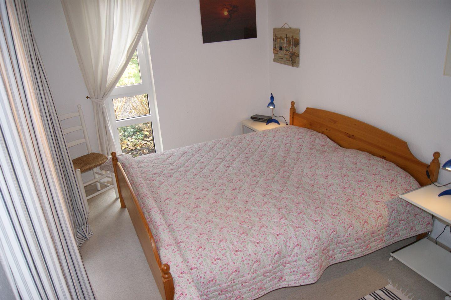 Das Ferienhaus verfügt über zwei gemütliche Schlafzimmer, die Ihnen erholsame Nächte bieten. Im oberen Schlafzimmer erwartet Sie ein großes Doppelbett mit zwei Matratzen und ein geräumiger Kleiderschrank. Das Schlafzimmer im Erdgeschoss bietet ebenfalls ein komfortables Doppelbett und einen praktischen Kleiderschrank.